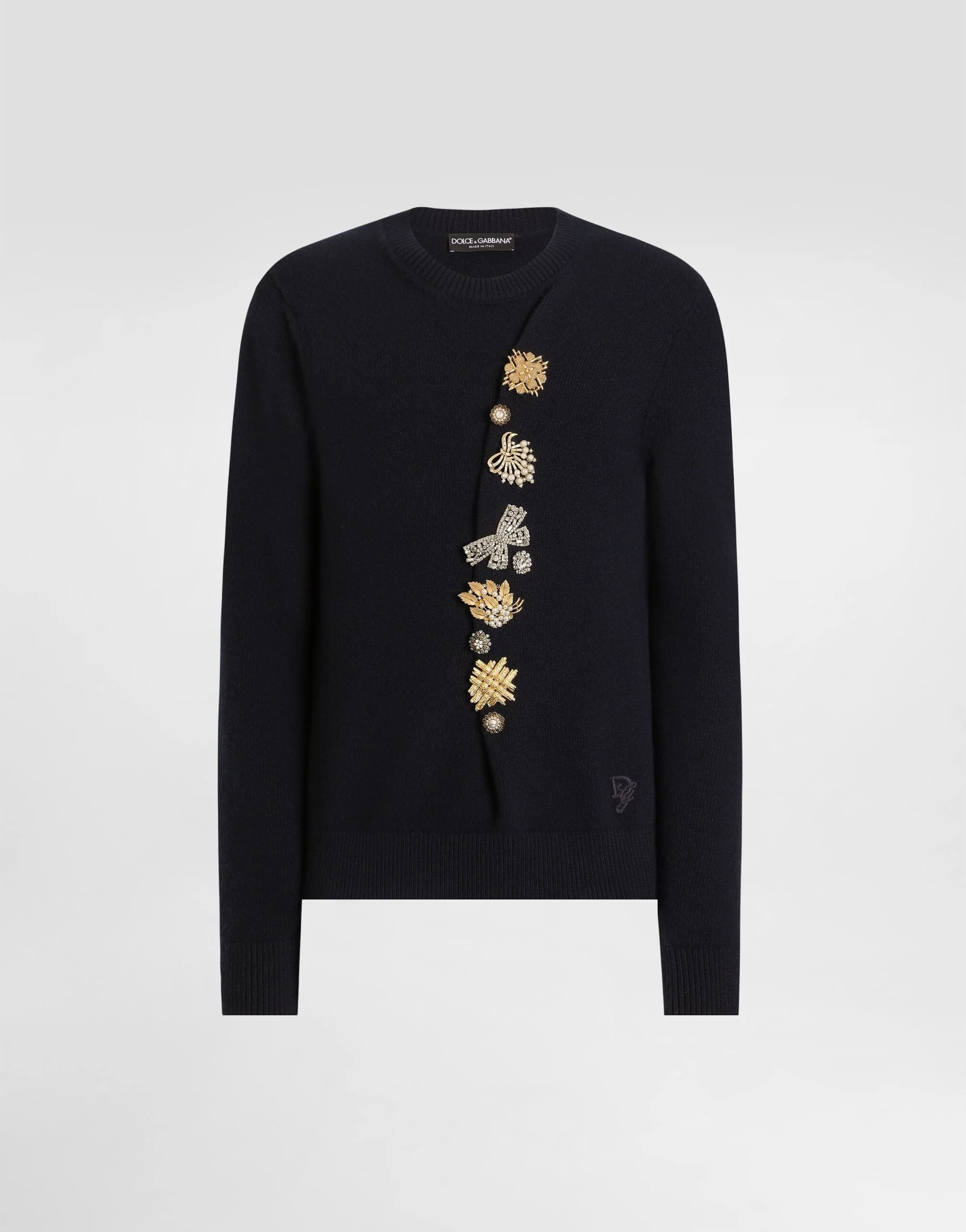 The Italian Holiday Men's Collection revisits 1950s style with a blend of relaxed fits and modern flair. Classic white shirts and tailored suits in refined fabrics contrast with casual denim and playful T-shirts featuring retro graphics with a futuristic twist. Bold prints—chessboards, cats, elegant lighters, and Mediterranean blue ribbons—alongside logo jacquard inspired by ties, infuse a contemporary edge into the essence of Italian holidays. Round-neck wool sweater with bejeweled buttons: • Blue • Regular fit • Long sleeves • Fine-rib sleeve trims and neck • 7-gauge plain knit • The piece measures 68 cm from the shoulder seam on a size IT 48 • Made in Italy External composition: 100% Virgin Wool