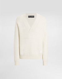 The Italian Holiday Men's Collection revisits 1950s style with a blend of relaxed fits and modern flair. Classic white shirts and tailored suits in refined fabrics contrast with casual denim and playful T-shirts featuring retro graphics with a futuristic twist. Bold prints—chessboards, cats, elegant lighters, and Mediterranean blue ribbons—alongside logo jacquard inspired by ties, infuse a contemporary edge into the essence of Italian holidays. Wool V-neck sweater with DG embroidery: • White • Regular fit • Long sleeves • Fine-rib sleeve trims and neck • 5-gauge plain knit • The piece measures 69 cm from the shoulder seam on a size IT 48 • Made in Italy External composition: 100% Virgin Wool