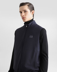 The Italian Holiday Men's Collection revisits 1950s style with a blend of relaxed fits and modern flair. Classic white shirts and tailored suits in refined fabrics contrast with casual denim and playful T-shirts featuring retro graphics with a futuristic twist. Bold prints—chessboards, cats, elegant lighters, and Mediterranean blue ribbons—alongside logo jacquard inspired by ties, infuse a contemporary edge into the essence of Italian holidays. Hooded woolen vest with tonal Dolce&Gabbana logo tag: • Blue • Regular fit • Zipper fastening • Front welt pockets and two inner pockets • TRAVEL label • Lined • The piece measures 78 cm from the rear collar seam on a size IT 48 • Made in Italy External composition: 55% Wool 4% Spandex 41% Polyester Internal composition: 95% Viscose 5% Spandex