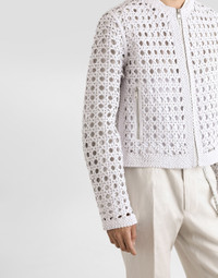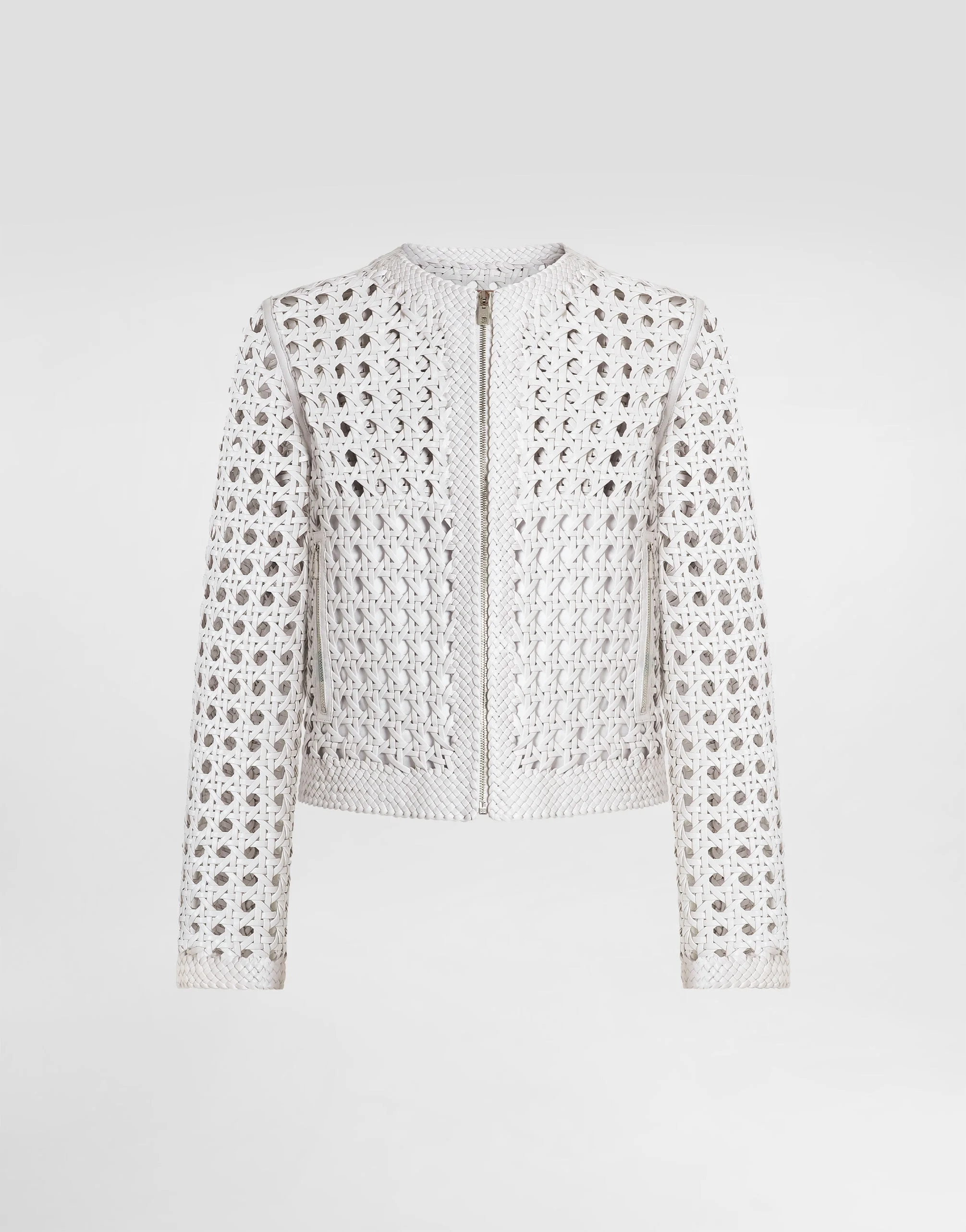 Italy and its beauty are reflected in the Men’s SS25 Collection. Woven raffia and leather give life to jackets, polo-shirts and sweaters to celebrating Italian craftsmanship. The color palette ranges from Nero Sicilia black to burgundy, contributing to conveying a sense of eternal elegance. Refined accessories complement the look: belts and loafers with hand-finished details and oversize bags, such as the Sicily, the Marlene with crocodile-effect print and the versatile Adamo tote. Woven nappa leather jacket: • White • Regular fit • Long sleeves • Zipper fastening • Zipped front pockets • Unlined • The piece measures 61 cm from the rear collar seam on a size IT 48 • Made in Italy External composition: 100% Sheepskin Internal composition: 100% Silk