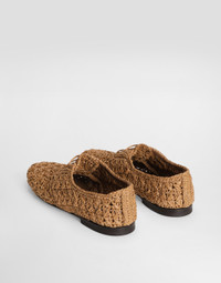 A symbol of timeless elegance, these woven raffia Derby shoes stand out with the quality of their materials and their flawless style, perfect for every occasion. Woven raffia Derby shoes: • Black • Crochet knit • Calfskin footbed with branded label • Branded leather sole • Item comes with a dust bag • Packaged in a branded box • Made in Italy External composition: 100% Viscose Internal composition: 83% Lambskin 17% Goatskin