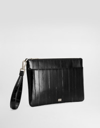 Discover our eel leather toiletry bag, a luxury accessory that combines functionality and style, perfect for the modern man. Eel skin necessaire: • Black • Leather handles • Ruthenium galvanic zip closure • Inner lining with flat pocket • External customization with monogalvanic plate • Internal stamp with film • Item equipped with a logo bag and a pre-assembled box • Measurements: H22 x W32 x D1 cm • Made in Italy External Composition: 100% Eel Skin