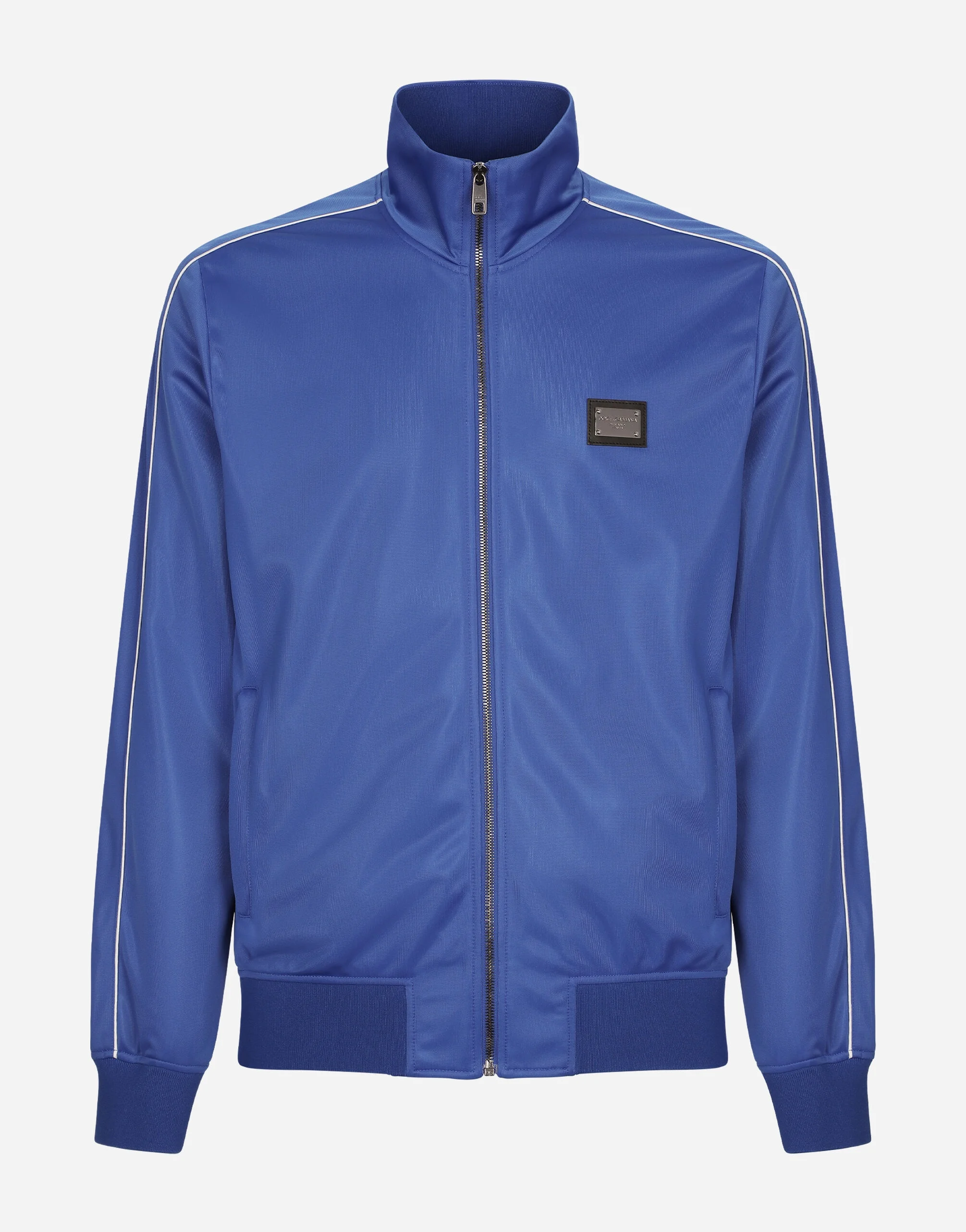 High-neck zip-up triacetate sweatshirt with metal Dolce&Gabbana logo tag and side bands featuring contrasting-colored piping: • Blue •Regular fit •Stretch knit hem and cuffs •Lined •The piece measures 68.5 cm from the rear collar seam on a size IT 48 •The model is 185 cm tall and wears a size IT 48 •Made in Italy Care And Details External composition: 100% Polyester Internal composition: 97% Polyester 3% Spandex