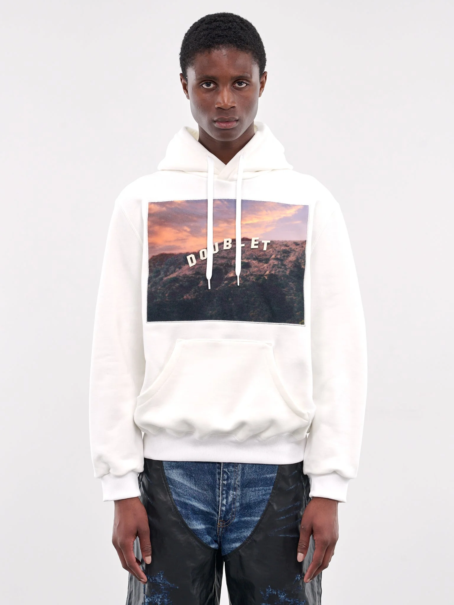 This white hoodie features an exclusive H.Lorenzo 40th Anniversary embroidered take on the Hollywood sign, set on a paneled cotton design. Detailed with a velcro logo lettering, adjustable drawstring hood, and a kangaroo pocket, the relaxed cut is finished with rib-knit cuffs and hem. A full set of mix-and-match velcro letters is included. Featuring: • Relaxed fit • Paneled cotton construction • Embroidered modified Hollywood sign graphic • Velcro logo embellishment • Full set of velcro mix-and-match letters included • Hood with adjustable drawstring • Long sleeves with rib-knit cuffs • Kangaroo pocket and straight hem • Made in Japan • 100% Cotton • Standard sizing Model is 6'1" wearing size M. Shoulders: 15.5" Chest: 31" Waist: 26"