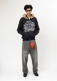 Faux fur collar detailed Graphic picture on chest Two pockets on side Distressed black color Regular fit 100% Cotton Made in Japan Model is wearing a size M Model is 6’ (183 cm), 125 pounds (56 kg), usually wears M in tops. A size 30 in denim and 46 in trousers. Size 10 in shoes *FINAL SALE*