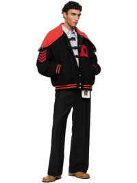 Wool-blend melton bomber jacket. - Fold-down hood with zip fastening - Drawstring and embroidered text at hood - Press-stud closure - Boucle logo applique at chest, sleeves, and back - Welt pockets - Striped rib-knit hem and cuffs - Full satin lining This item is part of a limited run of 61. Supplier color: Black