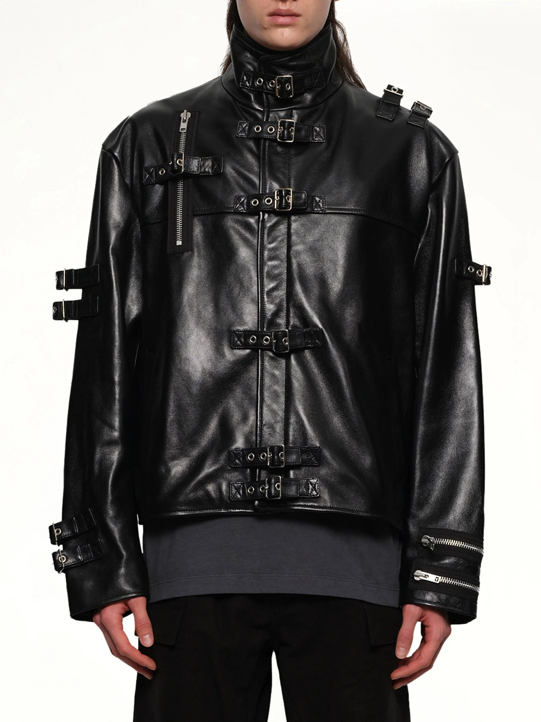 Doublet's Buckle Overload Leather Jacket in Black is a bold statement piece that combines edgy design with functional detailing. Perfect for those who want to stand out, this jacket offers a unique twist on a classic silhouette. - Composition: Sheep Skin - Features multiple buckle straps for adjustable fit and style. - Includes zippered pockets for secure storage. - Designed with a sleek, tailored fit for a modern look. - Accented with silver-tone hardware for a striking contrast. - Made in: nan Model is 187 cm and wears size M SKU: 25AW06BL222 BK