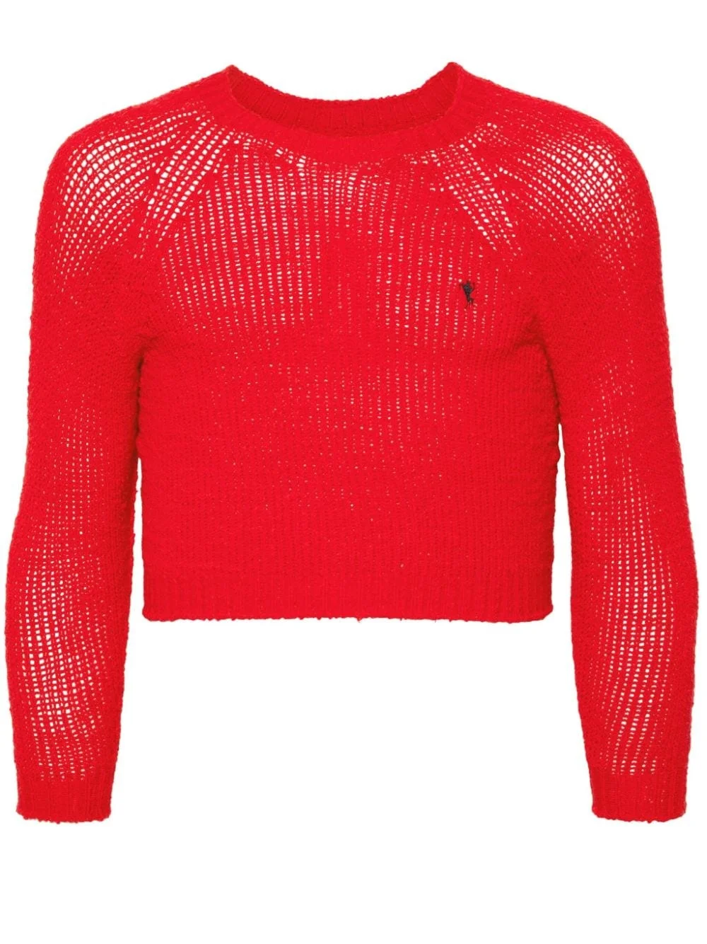 chunk-knit cropped jumper Highlights - Crimson red - Chunky knit - Mock neck - Embroidered logo at the chest - Half-length sleeves - Ribbed cuffs and hem - Cropped - When buying this unisex item, keep in mind that it is graded in standard men's sizing. Imported Composition Cotton 47%, Acrylic 47%, Nylon 4%, Polyurethane 2% SIZE & FIT Model measurements Height 5 ft 9 in(1.75 m) Bust/Chest 34.64 in(88 cm) Hips 36.61 in(93 cm) Waist 26.37 in(67 cm) Measurement CHEST 25.19 in(64 cm) LENGTH 13.77 in(35 cm) SLEEVE LENGTH 10.62 in(27 cm) WAIST 27.55 in(70 cm) FittingInformation This unisex piece is only produced in one size Cropped in length Made with a midweight knit, this piece offers some stretch