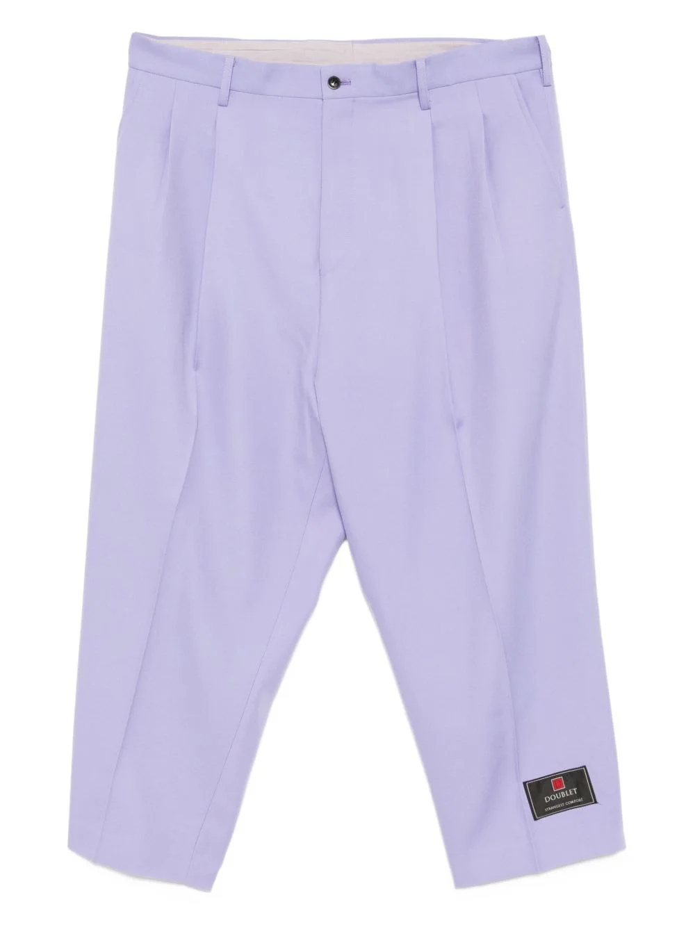 common-cutting trousers Highlights - Lavender purple - Front button and zip fastening - Two side slash pockets - Two rear jetted pockets - Logo patch to the front Imported Composition Lining: Cupro 100% Outer: Wool 100% Washing instructions Do Not Wash/Do Not Dry Clean