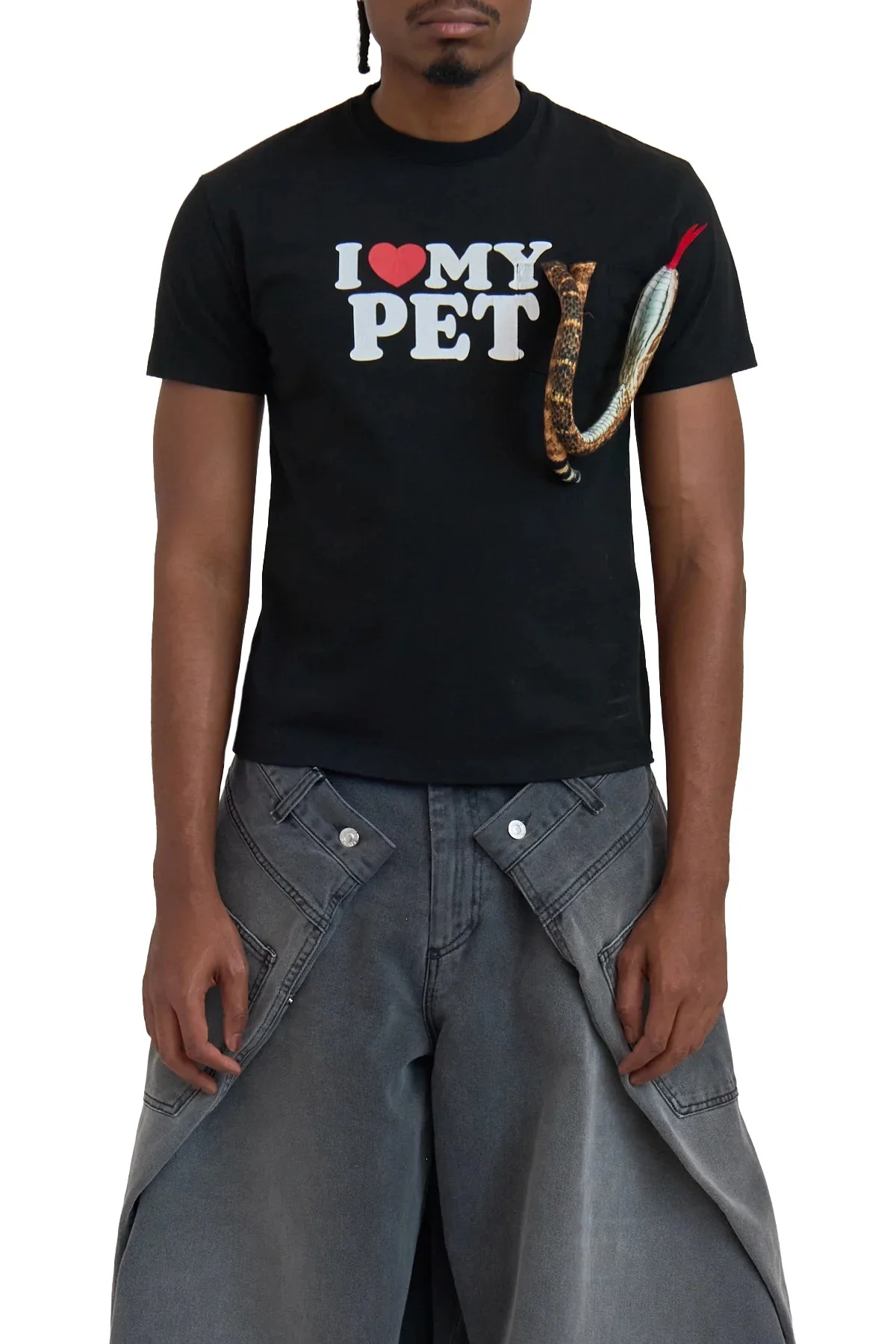 Doublet I Love My Pet short-sleeve cotton T-shirt in white featuring a front graphic print with 3D snake applique. Designed with a crew neckline and regular fit DETAILS Front graphic print with snake applique Crew neck Short sleeves Straight hem Material: 100% Cotton Product codes: - SKU: ESSX/DBL/AW25/25AW37CS399/Black/L - UPC: 1403558058377