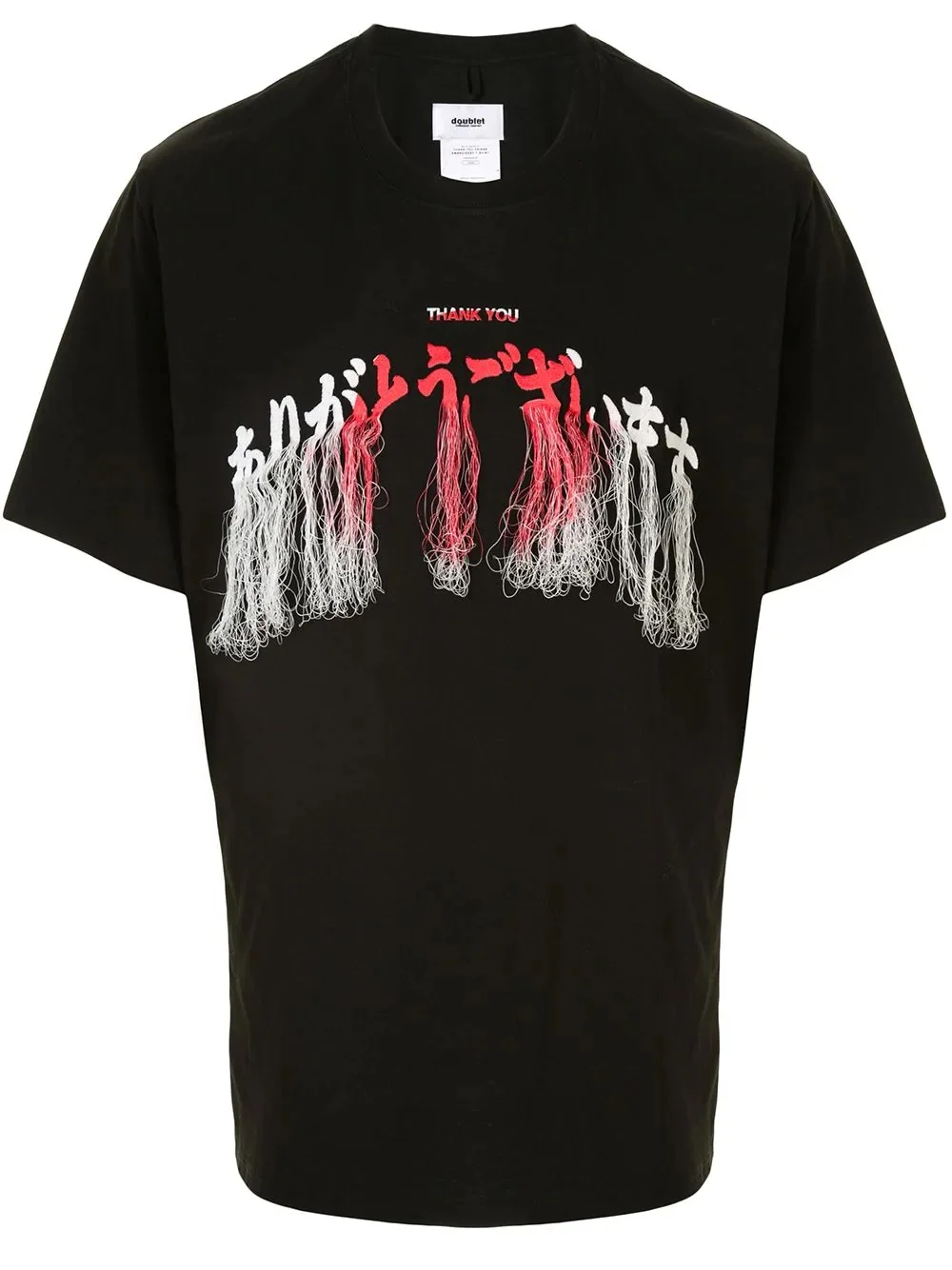 embroidered fringed T-shirt Highlights - Black - Cotton - Fringed details - Crew neck - Short sleeves - Straight hem Imported Composition Cotton 100% SIZE & FIT Model measurements Height 6 ft 1 in(1.86 m) Bust/Chest 34.64 in(88 cm) Hips 36.22 in(92 cm) Waist 27.16 in(69 cm) FittingInformation This piece fits true to size. We recommend you get your regular size Cut for a loose fit Washing instructions Dry Clean Only