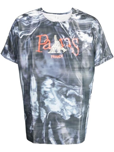 graphic-print cotton T-shirt blue all-over graphic print crew neck short sleeves straight hem Imported Composition Body: Polyester 73%, Nylon 27% SIZE & FIT Model measurements Height 6 ft 2 in(1.87 m) Bust/Chest 36.22 in(92 cm) Hips 37.79 in(96 cm) Waist 28.34 in(72 cm) Measurement CHEST 52.75 in(134 cm) LENGTH 26.77 in(68 cm) FittingInformation Designed to be unstructured, offering a loose fit throughout Made from a lightweight non-stretch fabric This piece fits true to size – take your usual size Washing instructions Dry Clean Only