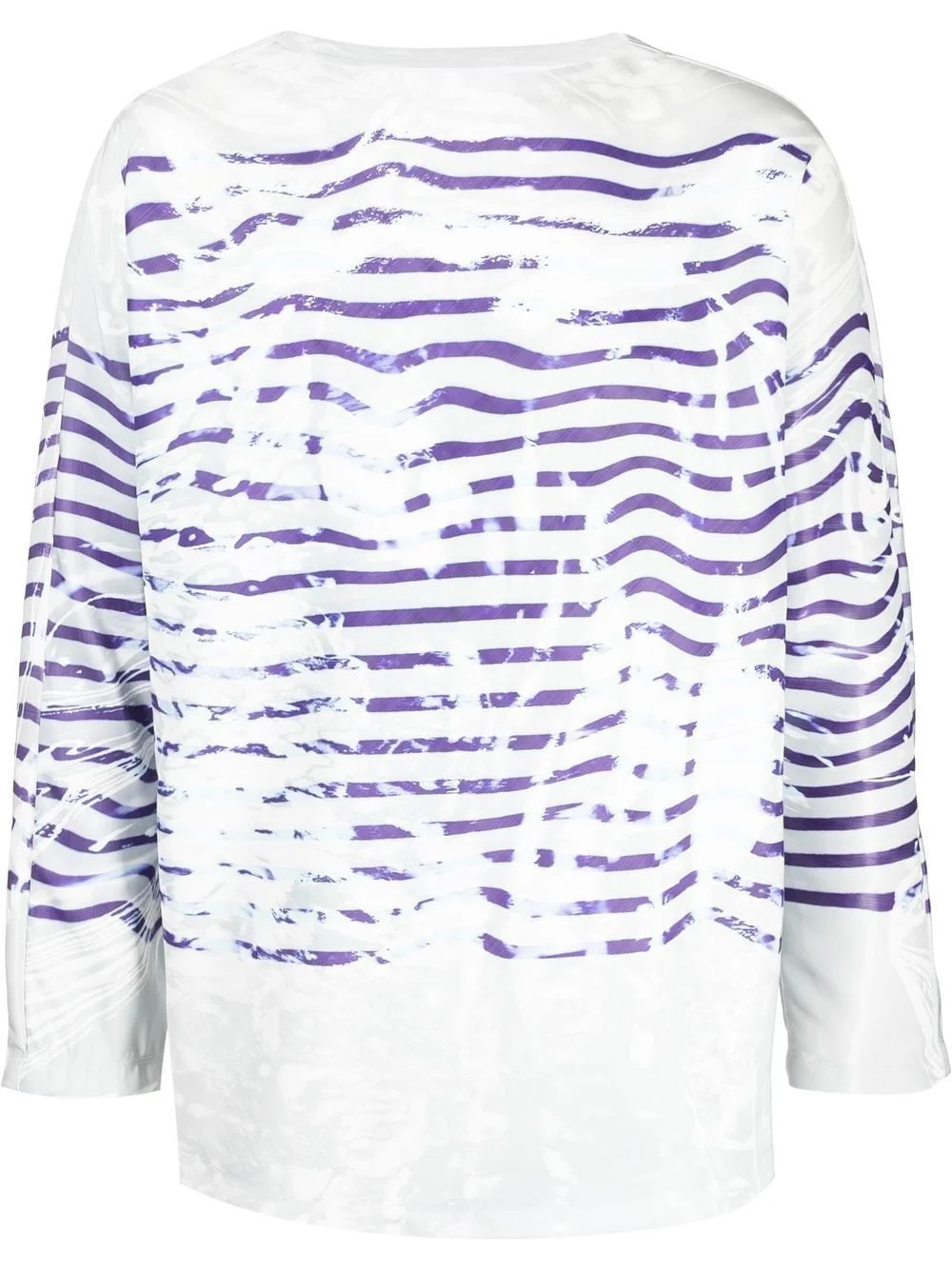 graphic-print long-sleeved top grey purple all-over graphic print artist stripe pattern boat neck long sleeves straight hem Imported Composition Polyester 73%, Nylon 27% SIZE & FIT Model measurements Height 6 ft 2 in(1.87 m) Bust/Chest 34.25 in(87 cm) Hips 36.22 in(92 cm) Waist 29.52 in(75 cm) Measurement CHEST 51.18 in(130 cm) LENGTH 26.37 in(67 cm) FittingInformation This piece fits true to size. We recommend you get your regular size Cut for a loose fit Made with a lightweight non-stretch fabric Washing instructions Dry Clean Only