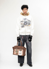 Faux fur collar detailed Graphic picture on chest Two pockets on side Distressed black color Regular fit 100% Cotton Made in Japan Model is wearing a size M Model is 6’ (183 cm), 125 pounds (56 kg), usually wears M in tops. A size 30 in denim and 46 in trousers. Size 10 in shoes *FINAL SALE*