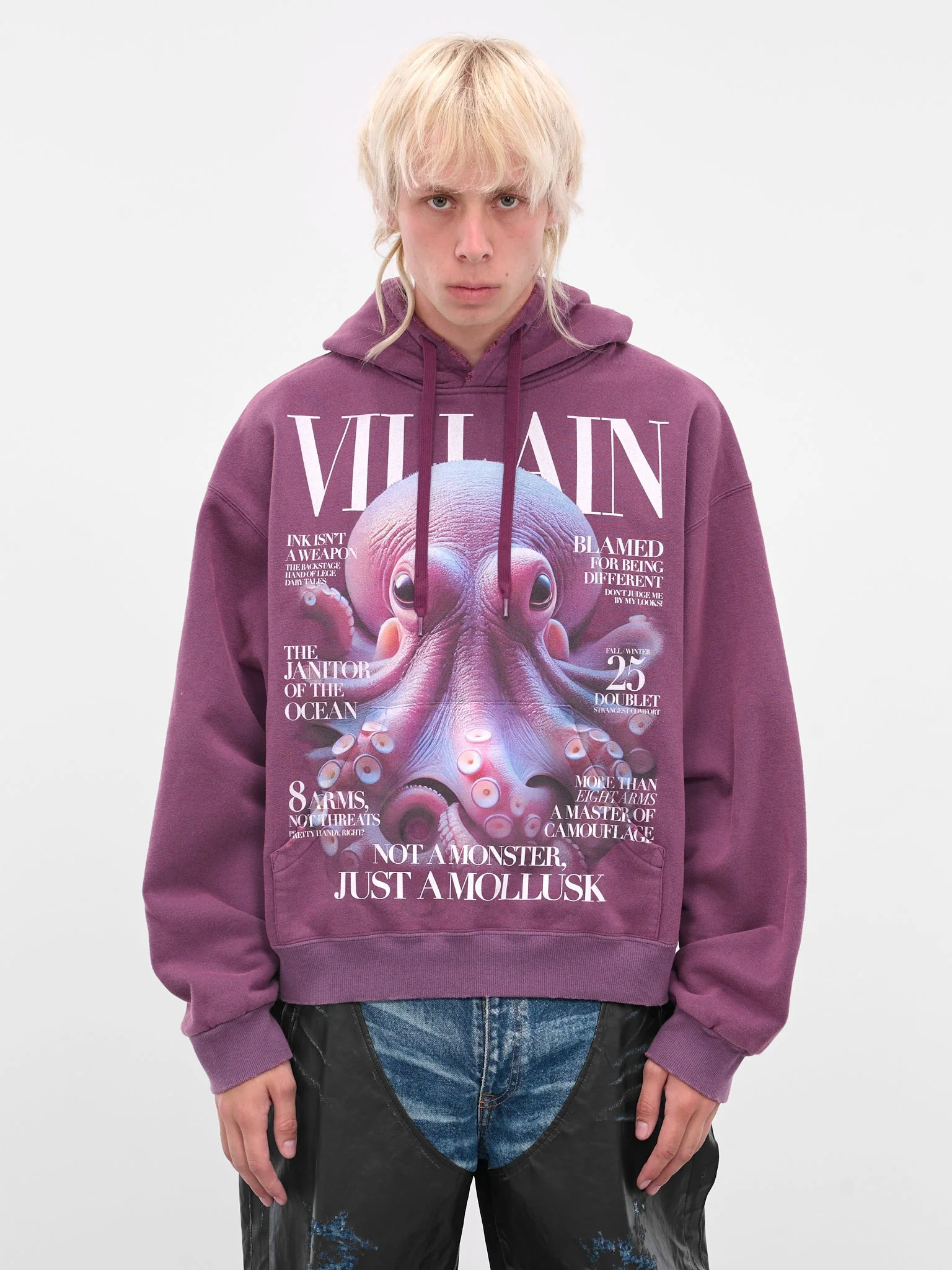 A purple hoodie with octopus graphic and lightly distressed details throughout, this piece is finished with a raw edged hood, boxy cropped fit, ribbed trims, and dropped shoulders for a sculptural, graphic look. Featuring: • Boxy fit with slight cropped length • Octopus graphic print with light distressing • Hood with adjustable drawstrings and raw edge • Dropped shoulders and long sleeves • Rib-knit cuffs and hem • Front kangaroo pocket • Made in Japan • 100% Cotton • Standard sizing