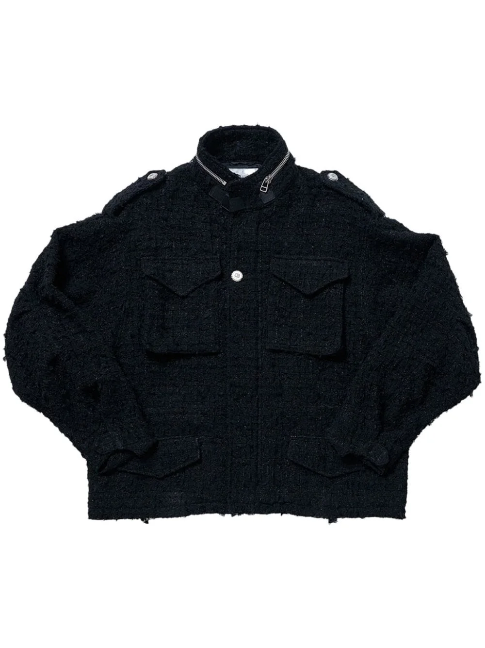 raw-cut tweed military jacket Highlights - Black - Cotton blend - Tweed - Zip detail - Silver-tone hardware - High neck - Front button fastening - Epaulettes - Long sleeves - Four front flap pockets - Raw-cut hem Imported Composition Cotton 81%, Nylon 6%, Polyester 5%, Rayon 4%, Paper 4% Washing instructions Read Manufacturer Guidelines