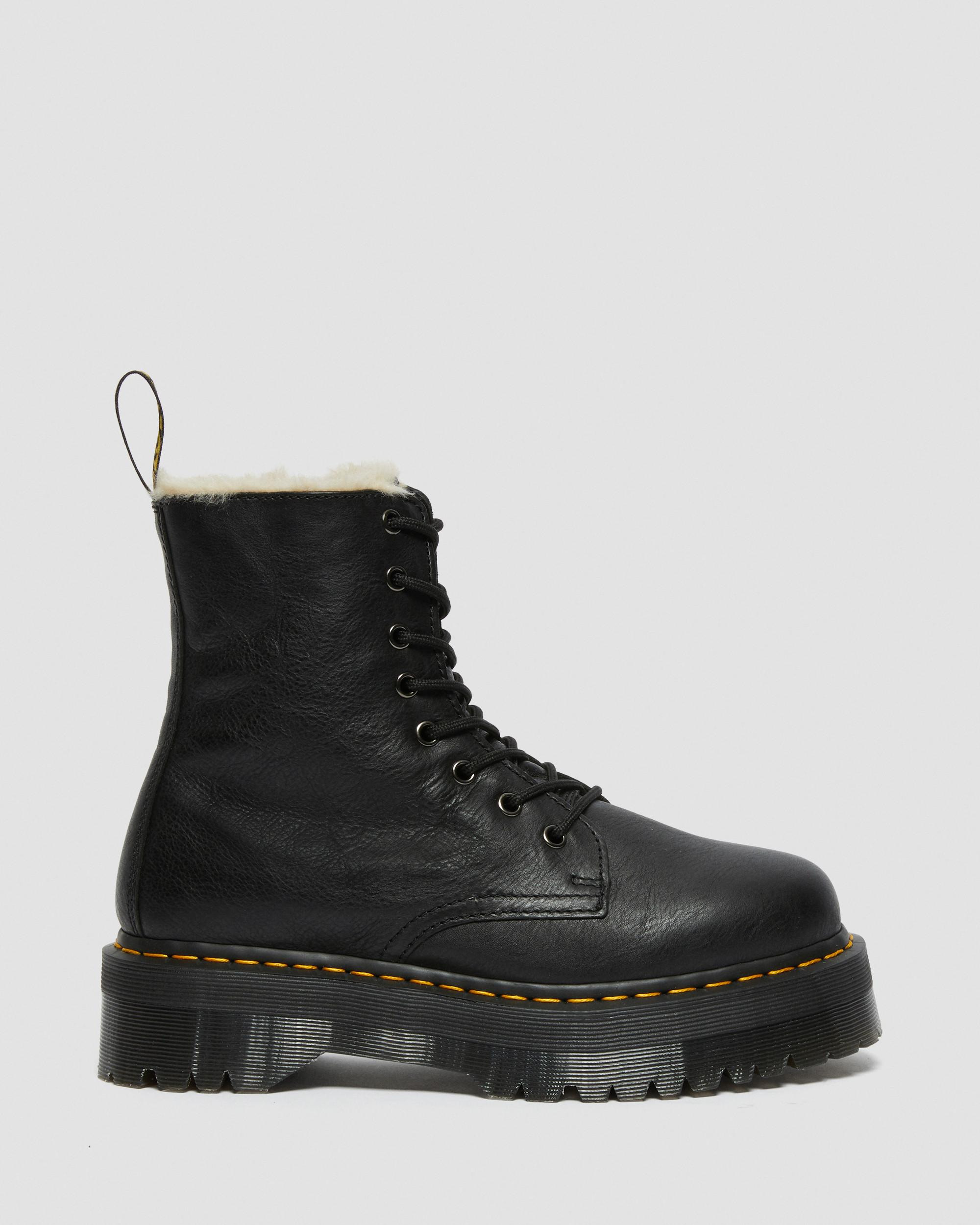 The Jadon boot is an energetic evolution of our iconic 8-eye boot. Lined with faux fur and built with soft Pisa leather, our Jadon Boot Faux Fur-Lined Platform sits on an empowering 2 inch platform sole. - Lined with soft faux fur and built on the iconic and comfortable Dr. Martens air-cushioned sole - A fearless evolution of our 8-eye boot — elevating the silhouette to unmissable new heights. Stand taller. Feel bolder - Standing at 2 inch with a chunky commando tread — the Quad Retro sole was built to empower. Seen on our smash-hit Jadon boot — for people who aren't afraid to stand tall - Construction - Made with our Goodyear-welted lines that are heat-sealed at 700˚C and reinforced with our signature welt stitch - Sole Height - Platform height: 1 1/2 in; Heel height: 2 in - Footbed - Slimmer and a more tapered shape Material Pisa - a medium-weight milled nappa leather with a super-soft tumbled handle and richly pigmented waxy finish. Construction Goodyear Welted - the upper and sole are heat-sealed and sewn together, providing more comfort and durability for years to come. Product code 25637001
