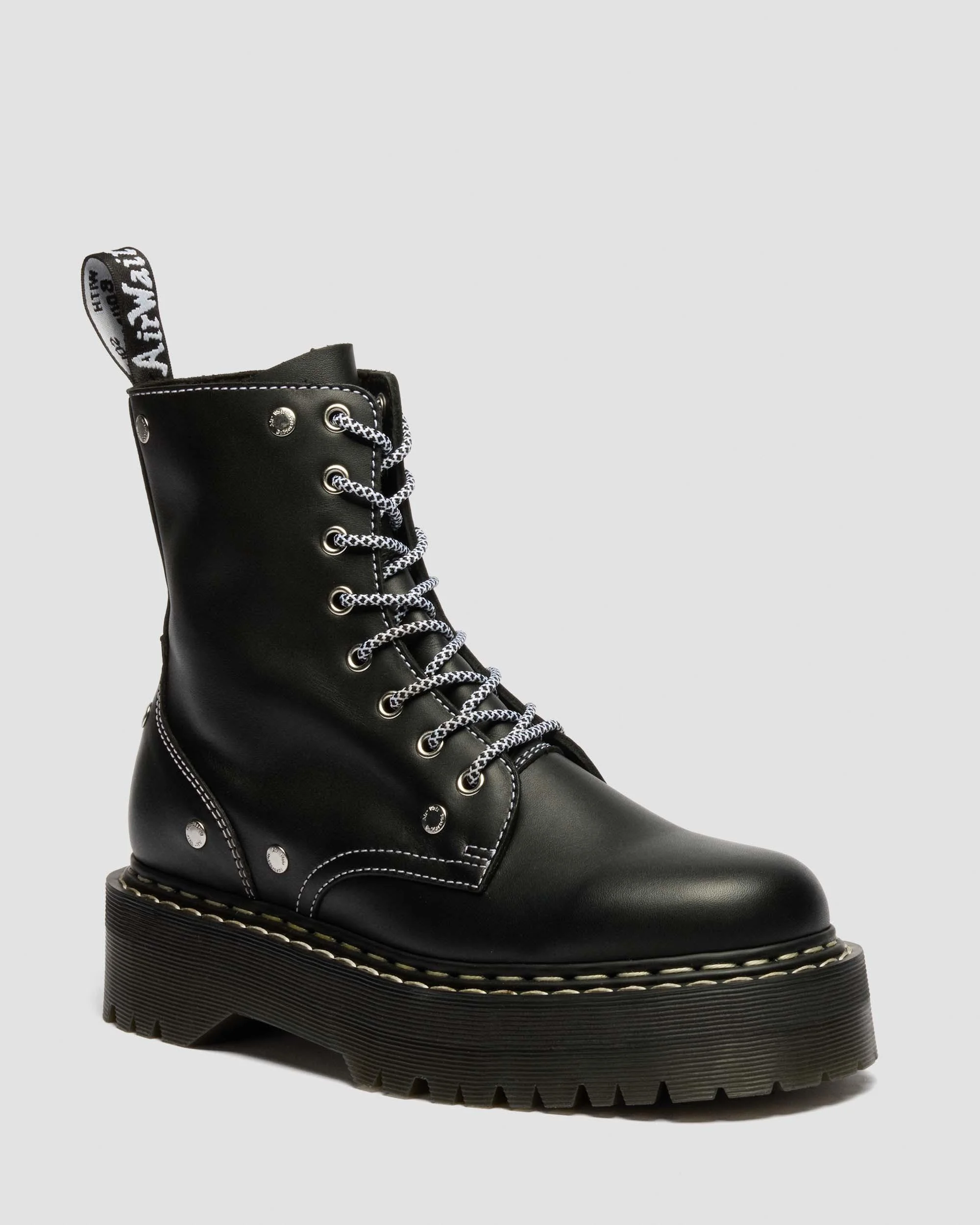 Stand tall. Stand bold. The Jadon 8-eye boot channels six decades of Doc’s DNA into a striking platform silhouette. Crafted from black Sendal leather, it’s tough yet ready to shape to you with every wear. This monochrome edition features black-and-white giraffe laces, a matching black-and-white heel loop, and double white welt stitching for a crisp, graphic edge. The extra-tall, grooved sole and convenient inside zip make it easy to step into. Material Sendal is a high quality, naturally soft leather that’s smooth and hardwearing. Construction Goodyear Welted - the upper and sole are heat-sealed and sewn together, providing more comfort and durability for years to come. Product code 43031001