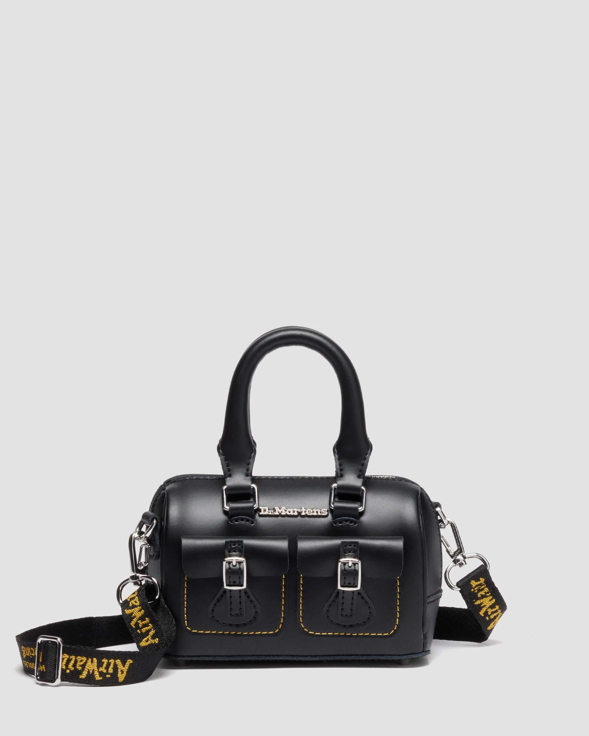 Shrunken design with major impact. The Mini Top Handle bag proves that originality comes in all sizes. Constructed with supple Kiev leather, a PU-coated version of our classic Smooth leather, the bag is fortified with sturdy top handles and a removable crossbody AirWair webbing strap. An inner compartment is large enough to fit a mobile phone, and two functional outer pockets are easy to access for smaller items. True to traditional DM’s craft and style, yellow welt stitching traces the pockets, and silver hardware contrasts with the black leather, including a zip, studs, buckles and feet. Material Kiev - A PU coated version of our classic Smooth leather. Product code 41242001