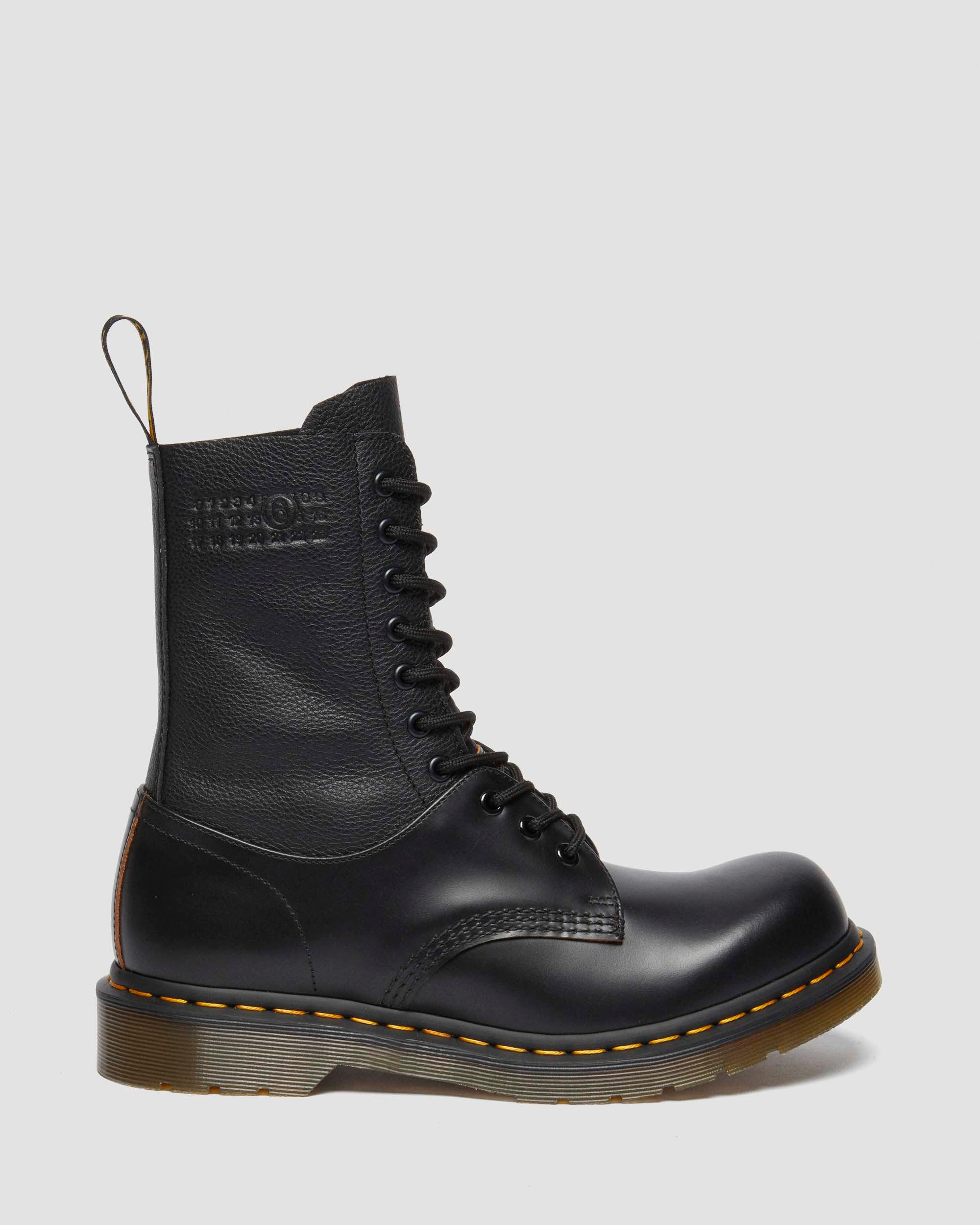 A reconstruction of foundational silhouettes. The 1490 boot fused with a bump toe 1461 shoe. The 10-eye hybrid is built from a combination of extra-soft Virginia and durable Vintage Smooth leather to accentuate the contrast between the boot and shoe forms. Debossed with the MM6 numeric signature and engrained with their deconstructivist approach to design. Set on the foundational DMS outsole with a yellow welt stitch. Finished with an AirWair heel loop. Construction Goodyear Welted - the upper and sole are heat-sealed and sewn together, providing more comfort and durability for years to come. Product code 32185001