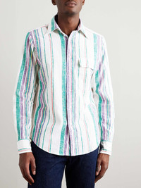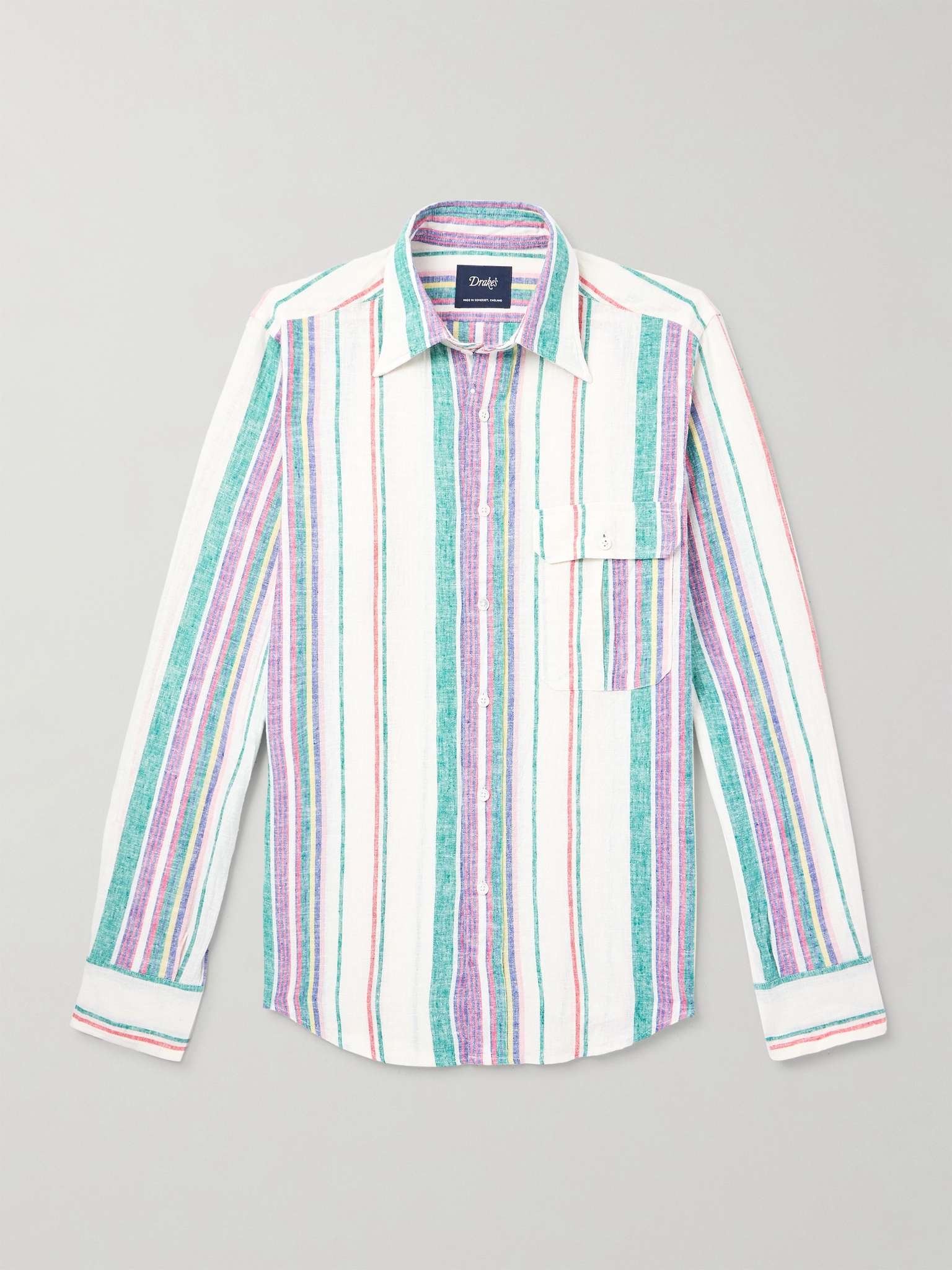 Drake's began with haberdashery, so it understands the value of pattern. This shirt has been made in England from a linen and cotton-blend woven with muticoloured stripes in bright tones. Size & Fit - Fits true to size, however those who are between sizes should take the larger size - Designed for a regular fit - Lightweight, non-stretchy fabric - Model is shown wearing a UK 15.5 - Model measures: chest 38"/ 96cm, height 6'0"/ 183cm Details & Care - Multicolored linen and cotton-blend - Button fastenings - 55% linen, 45% cotton - Machine wash - Mother-of-pearl: Australia
