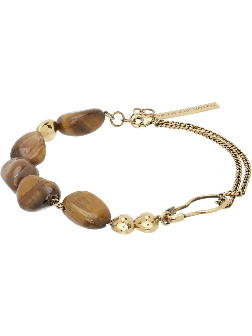 Curb chain bracelet in antiqued silver-tone brass. · Beaded stones in brown at length · Logo plaque at adjustable clasp · L9.25" Supplier color: Tiger eye Brass, stone. Made in Italy 252358M142008