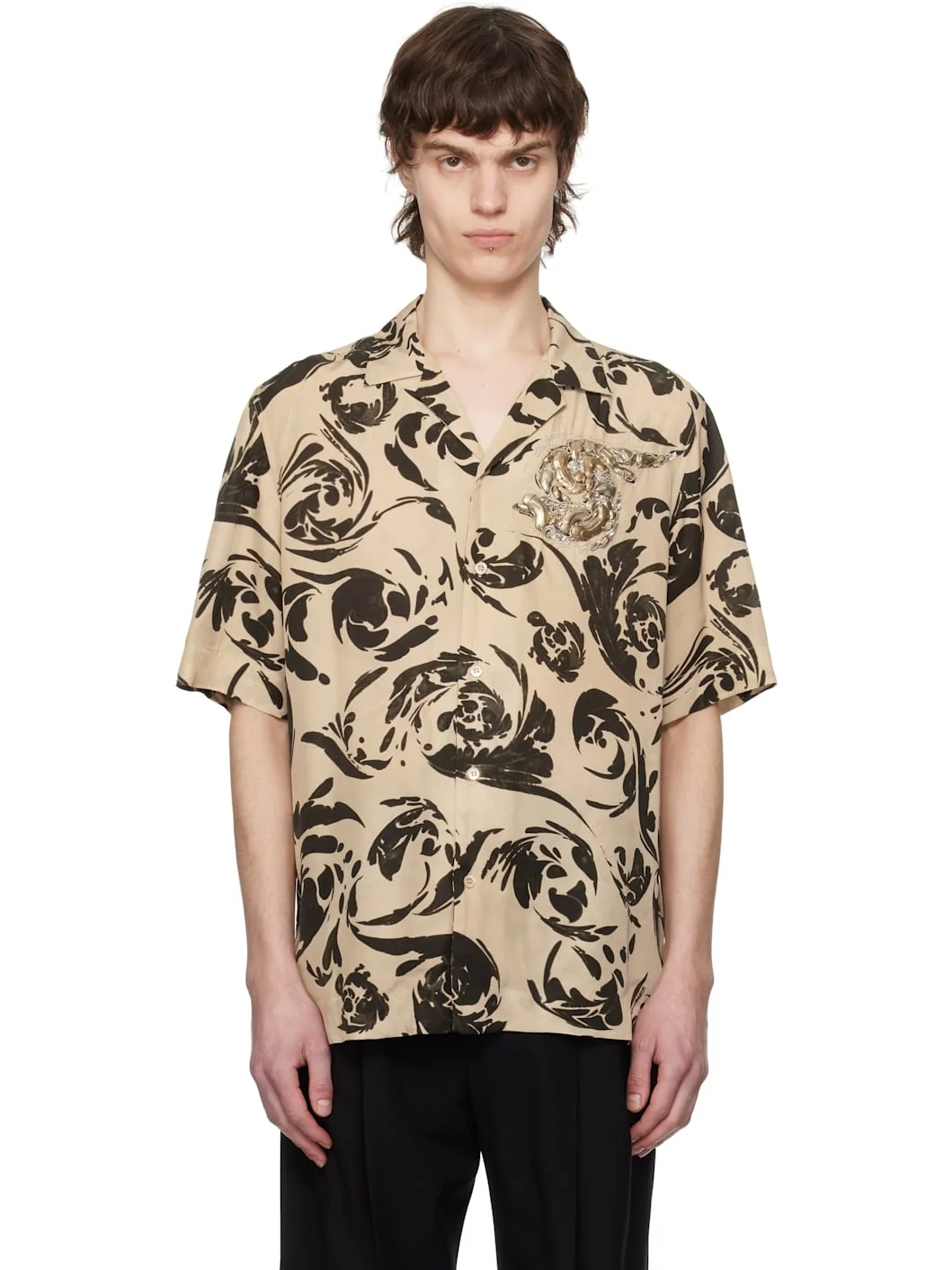 Viscose satin shirt. Graphic pattern printed throughout. · Open spread collar · Button closure · Metallic thread detailing at chest · Metal applique at chest · Twin pleats at back yoke · Vented side seams Supplier color: Black 100% viscose. Made in India 251358M192081