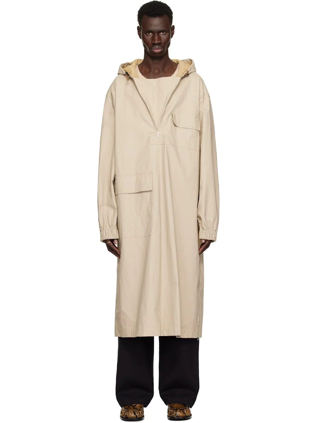 Polyurethane-coated linen canvas coat. · Cord-lock drawstring at hood · Stand collar · Half-zip closure · Flap pockets · Zip vent at side seam · Elasticized cuffs Supplier color: Sand 65% linen, 35% polyurethane. Made in Bulgaria 251358M176042