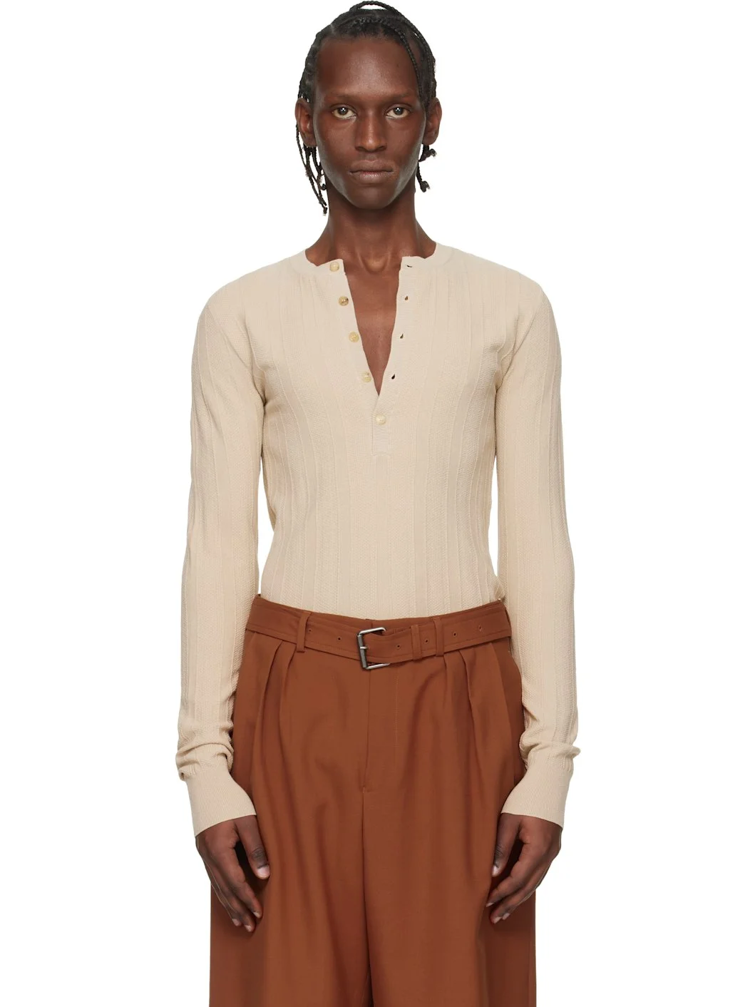 Rib-knit viscose-blend henley. · Crewneck · Five-button placket Supplier color: Beige 70% viscose, 30% polyester. Made in Belgium 261358M211001
