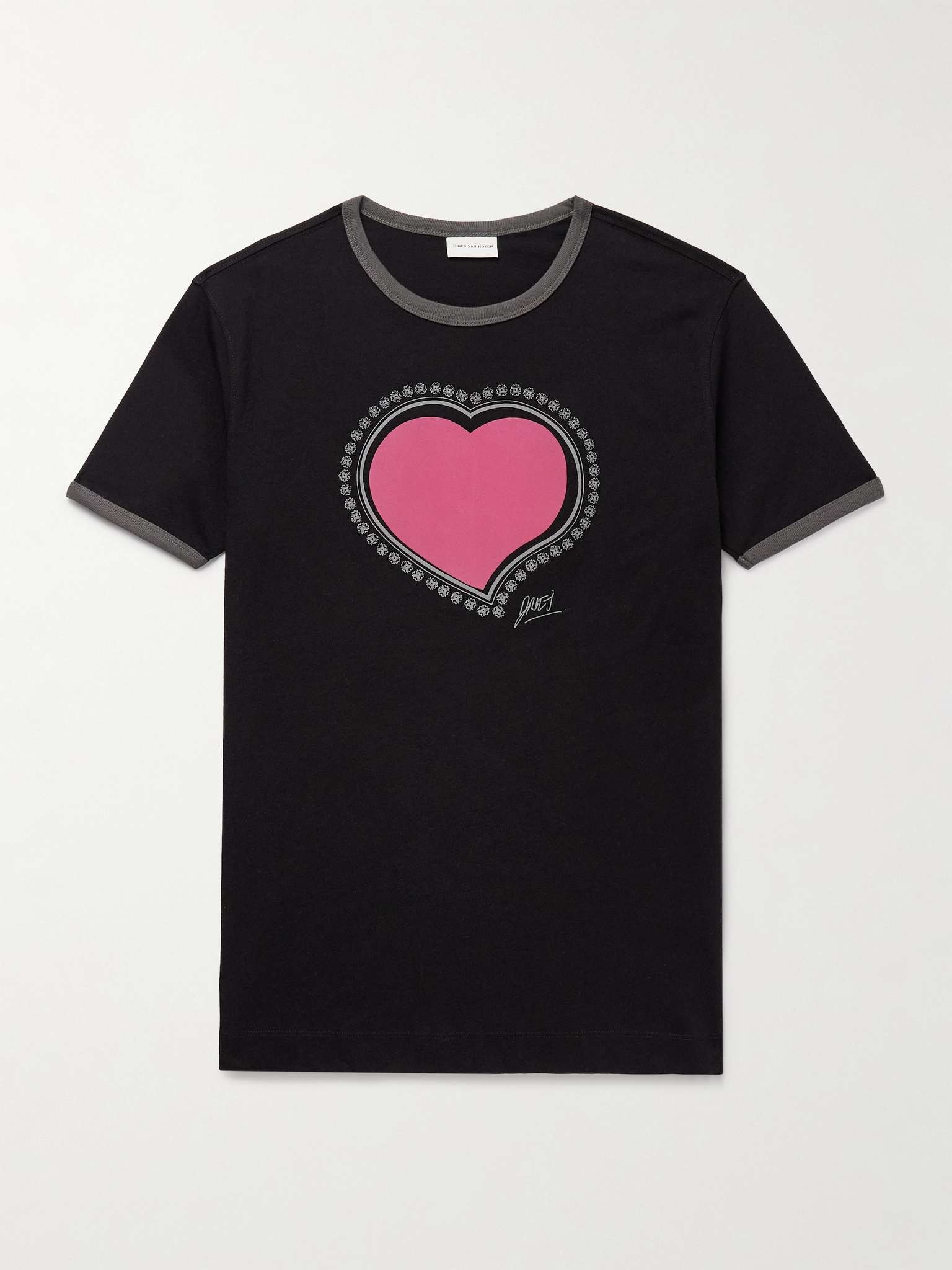 Dries Van Noten's T-shirt features one of the house's archival prints, complete with the founder's signature and updated with an appliqued pink heart. It's cut slim from soft cotton-jersey and has ringer-style trims. Size & Fit - Fits small to size. Take one size larger than normal - Those with broad shoulders may wish to take a further size up - Designed for a slim fit - Lightweight, stretchy fabric - S/M/L sizing Details & Care - Black and grey cotton-jersey - 100% cotton - Machine wash or dry clean