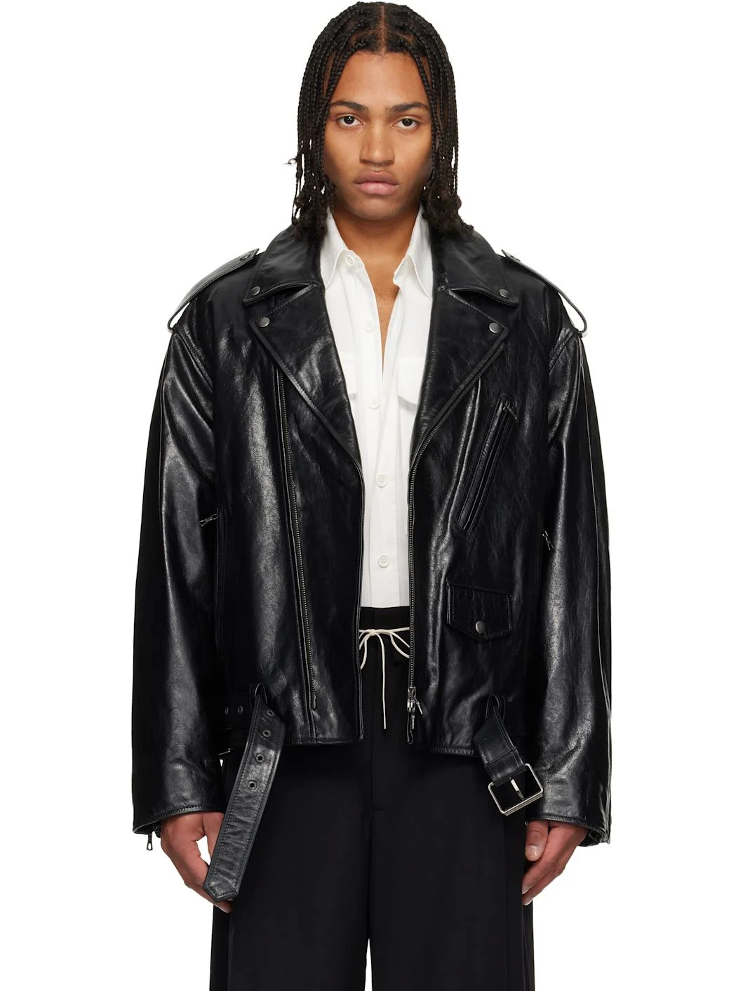 Grained leather jacket. · Notched lapel · Offset zip closure · Zip pockets at front · Flap pocket at front · Integrated pin-buckle strap at hem · Epaulets · Zip expansion panel at cuffs · Graphic printed at back · Welt pockets at interior · Full quilted satin lining Supplier color: Black Body: 100% leather. Lining: 43% cotton, 35% cupro, 20% polyester, 2% nylon. Made in Turkey 252358M181001