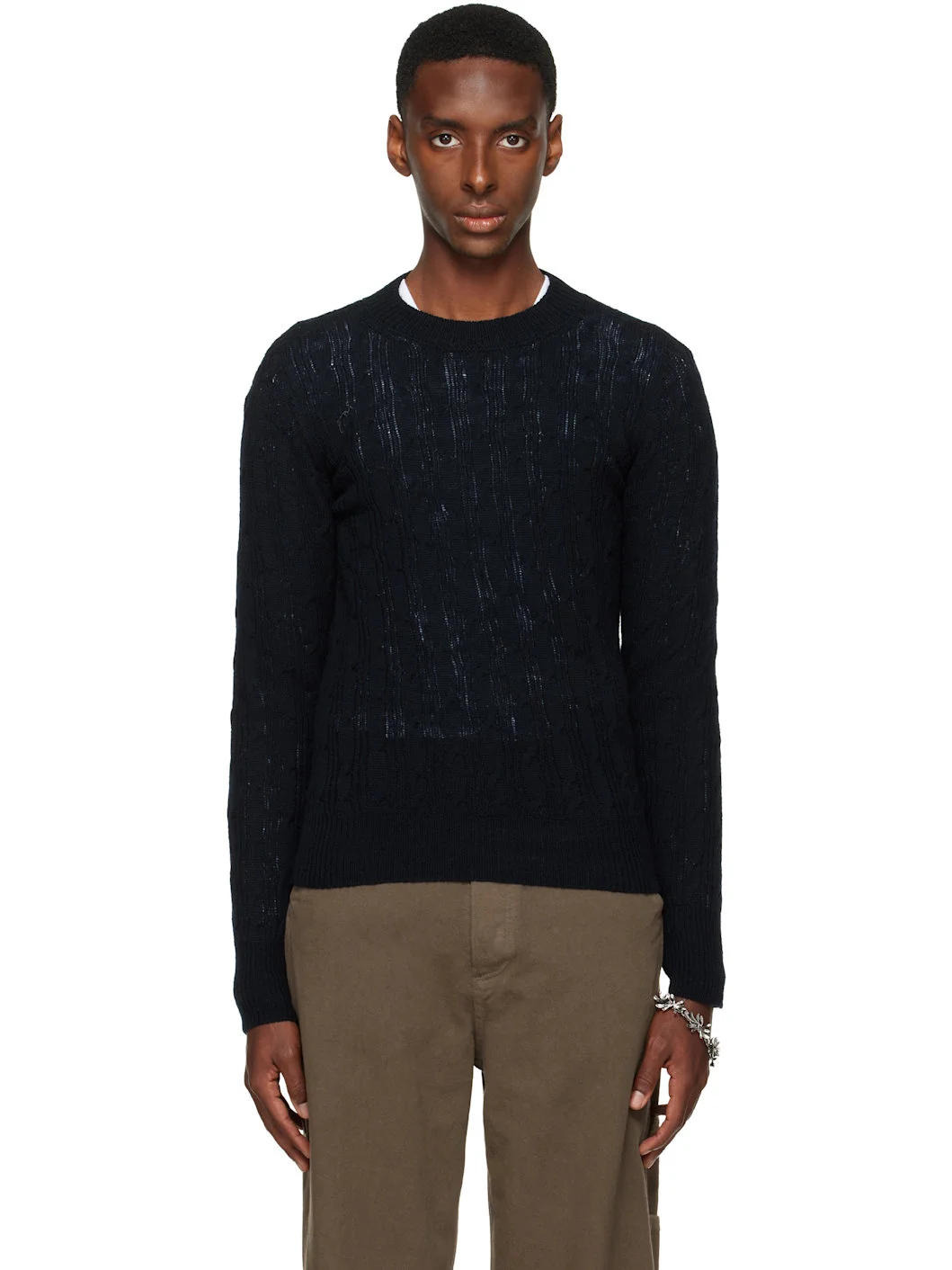 Cable-knit wool sweater. Rib-knit crewneck, hem, and cuffs. Supplier color: Black 100% wool. Made in Belgium 252358M201024
