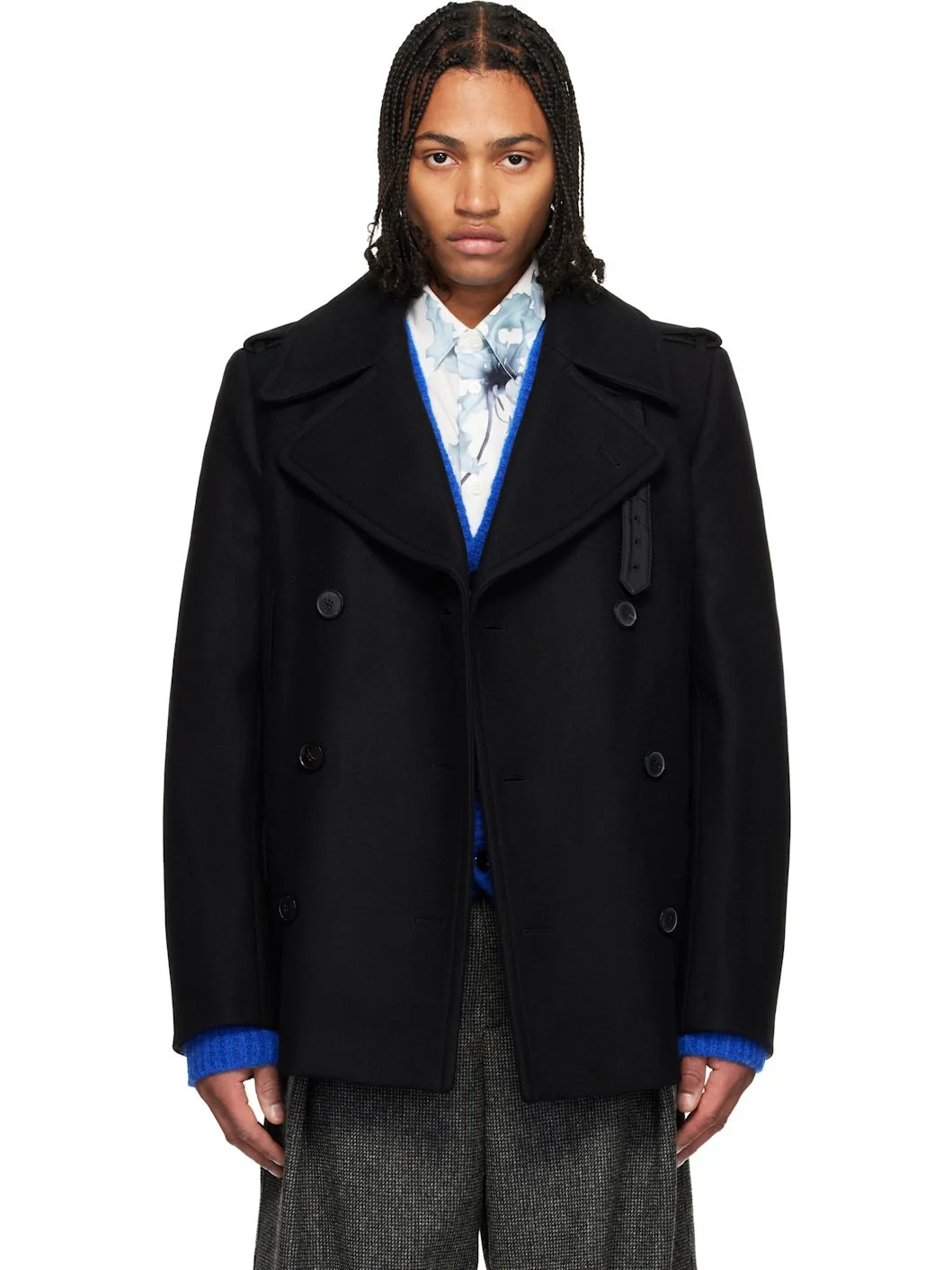 Wool-blend melton peacoat. · Detachable trim at spread collar · Double-breasted button closure · Welt and flap pockets at front · Buttoned epaulette at shoulders · Central vent at back hem · Welt pocket at interior · Full cupro twill lining Supplier color: Black Body: 70% wool, 30% polyamide. Lining: 100% cupro. Made in Poland 252358M183000