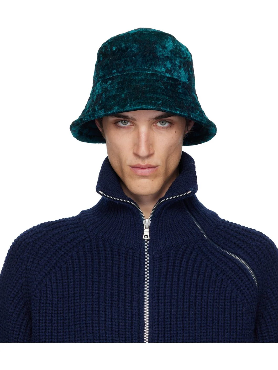 Wool-blend velvet bucket hat. · Jacquard graphic pattern throughout · Quilted brim · Cotton twill lining · Includes velvet drawstring travel bag Supplier color: Petrol Body: 59% polyester, 41% wool. Lining: 100% cotton. Made in Bulgaria 252358M138000