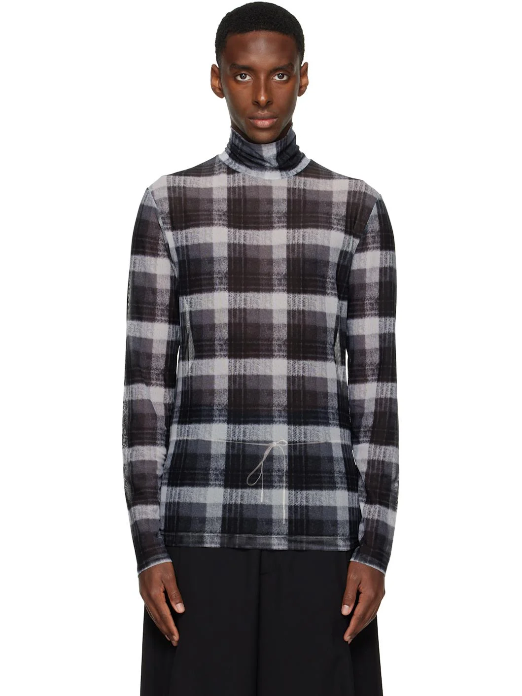 Semi-sheer stretch mesh turtleneck. Check pattern printed throughout. Supplier color: Black 94% polyamide, 6% elastane. Made in Turkey 252358M205017