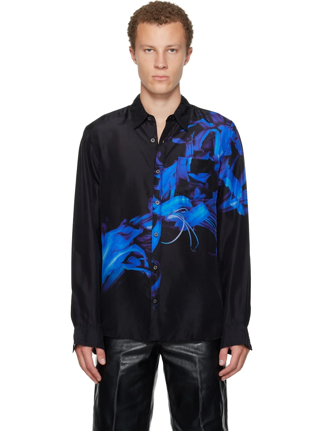 Silk voile shirt. · Spread collar · Button closure · Graphic printed at front and sleeve · Patch pocket at chest · Shirttail hem · Adjustable buttoned barrel cuffs Supplier color: Black 100% silk. Made in Hungary 252358M192068