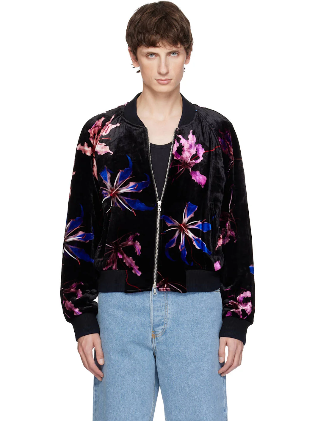 Viscose- and silk-blend velvet bomber jacket. · Floral pattern printed throughout · Rib-knit stand collar, hem, and cuffs · Two-way zip closure · Zip pockets at waist · Raglan sleeves · Welt pocket at interior · Full twill lining Supplier color: Black 82% viscose, 18% silk. Lining: 51% cotton, 49% viscose. Made in Hungary 252358M175002