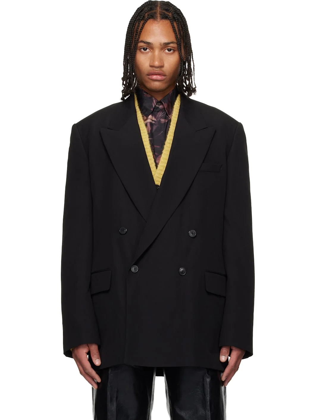 Plain-woven wool blazer. · Peaked lapel · Double-breasted button closure · Welt pocket at chest · Flap pockets at waist · Padded shoulders · Surgeon's cuffs · Welt pocket at interior · Full satin lining Supplier color: Black Body: 100% wool. Lining 1: 100% cupro. Lining 2: 100% viscose. Made in Morocco 252358M195023