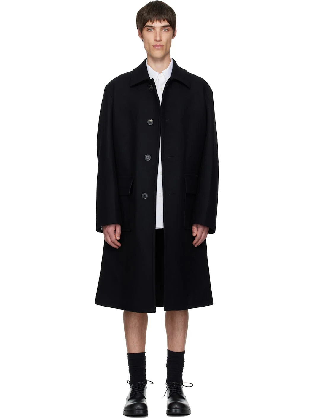 Wool-blend melton coat. · Spread collar · Button closure · Flap pockets at waist · Dropped shoulders · Central vent at back hem · Welt pockets at interior · Full satin lining Supplier color: Black Body: 70% wool, 30% polyamide. Lining: 60% cupro, 40% cotton. Made in Romania 252358M176034