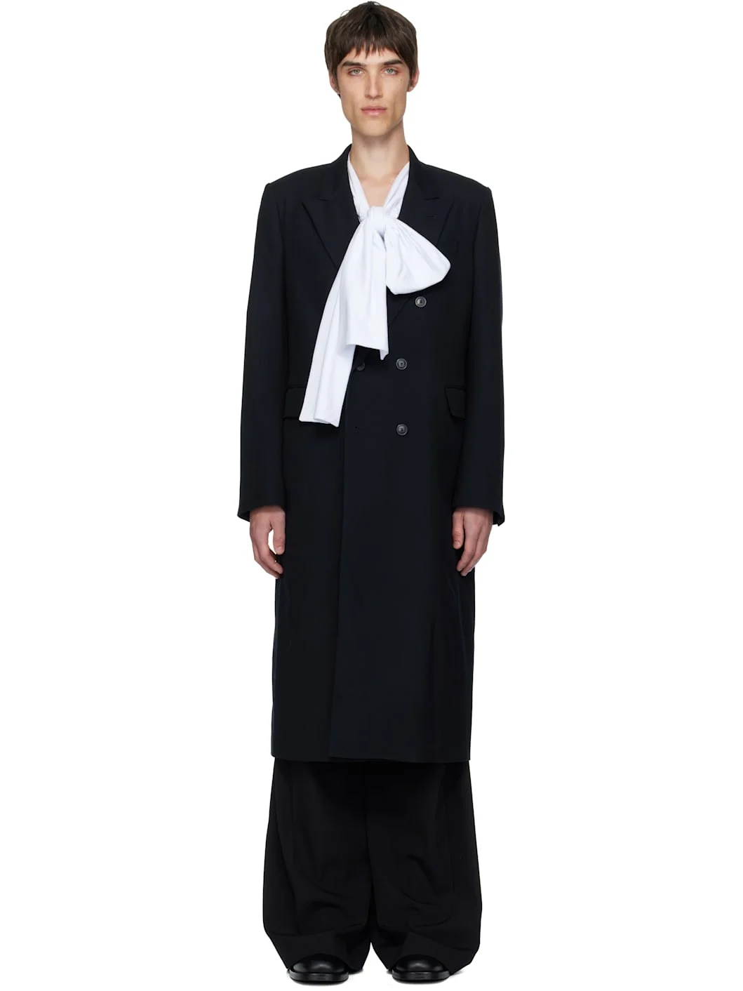 Wool twill coat. · Peaked lapel · Double-breasted button closure · Welt pocket at chest · Flap pockets at waist · Padded shoulders · Surgeon's cuffs · Central vent at back hem · Welt pocket at interior · Full satin lining Supplier color: Black 100% wool. Made in Morocco 252358M176013