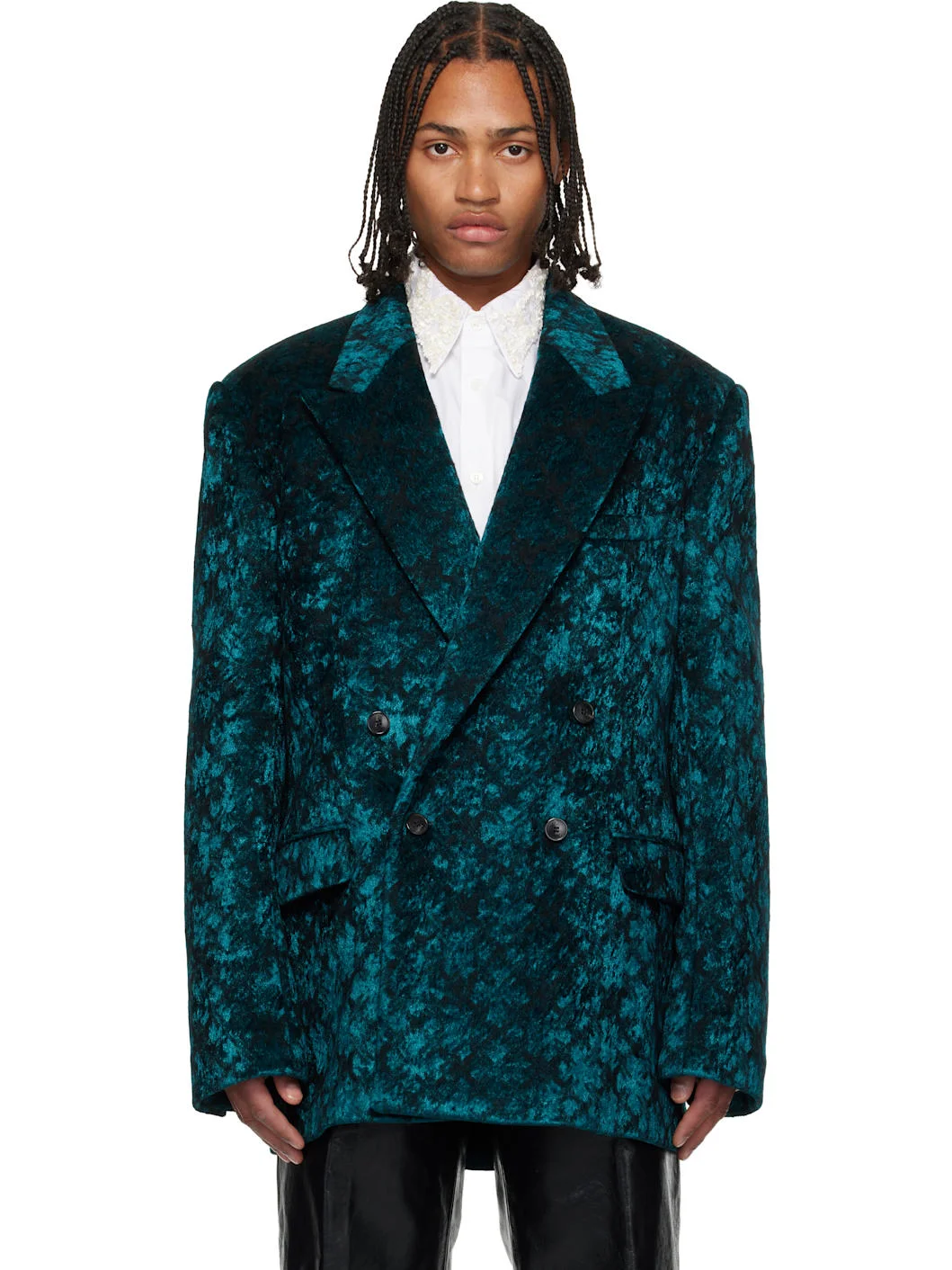 Wool-blend velvet blazer. · Jacquard graphic pattern throughout · Notched lapel · Double-breasted button closure · Welt pocket at chest · Flap pockets at waist · Padded shoulders · Surgeon's cuffs · Welt pocket at interior · Twill lining Supplier color: Petrol Body: 59% polyester, 41% wool. Lining: 51% cotton, 49% viscose. Made in Morocco 252358M195022