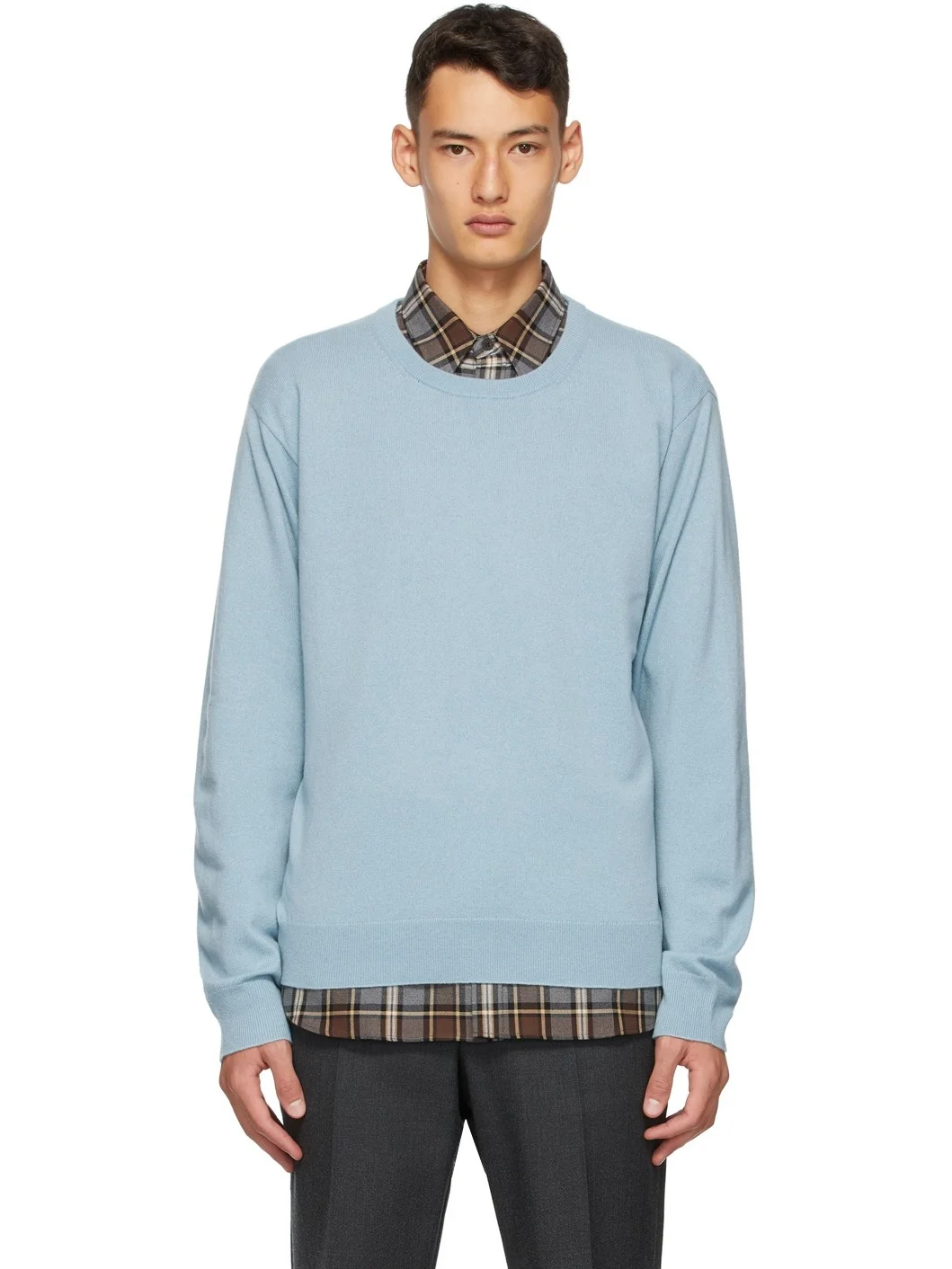 Long sleeve knit cashmere sweater in blue. Rib knit crewneck collar, cuffs, and hem. Supplier color: Light blue 100% cashmere. Made in Belgium 202358M201013