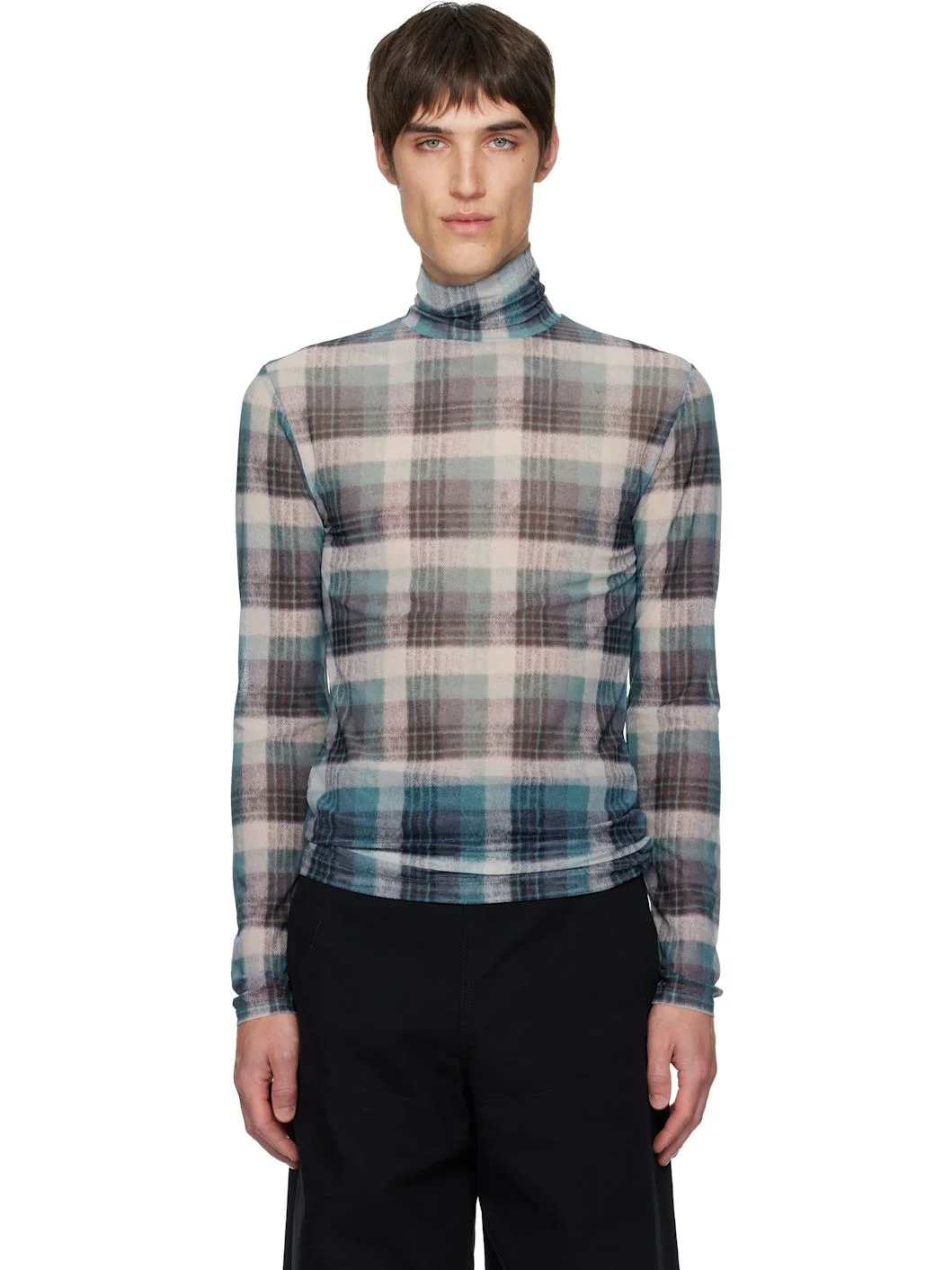 Semi-sheer stretch mesh turtleneck. Check pattern printed throughout. Supplier color: Turquoise 94% polyamide, 6% elastane. Made in Turkey 252358M205019