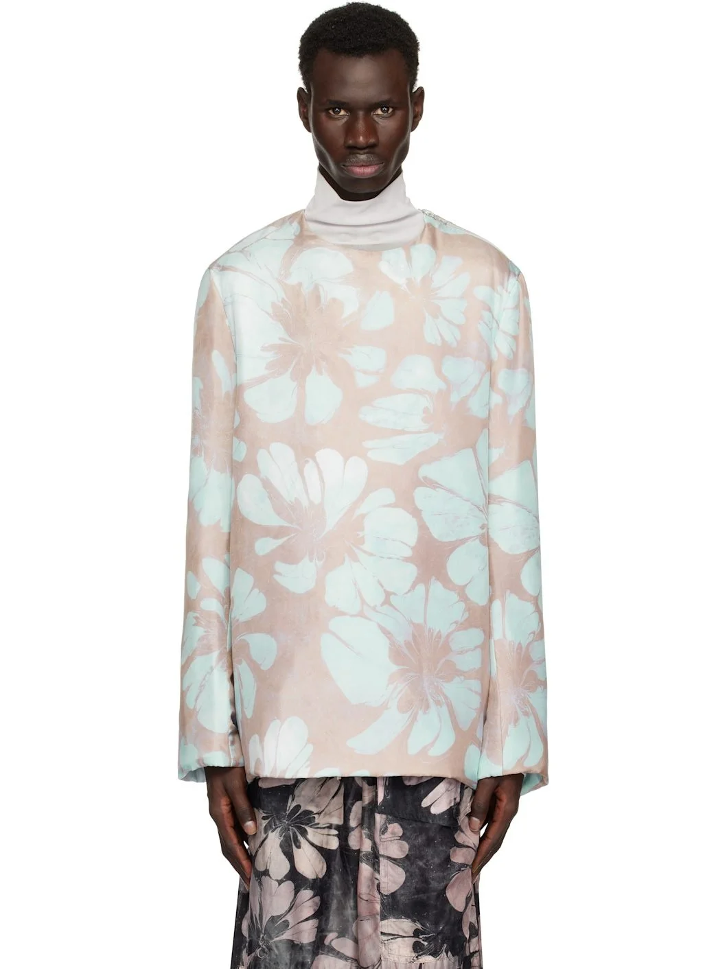 Padded silk satin top. Floral pattern printed throughout. · Crewneck · Zip closure at shoulder · Zip vent at side seam · Full silk satin lining Supplier color: Pale blue 100% silk. Made in Belgium 251358M213094