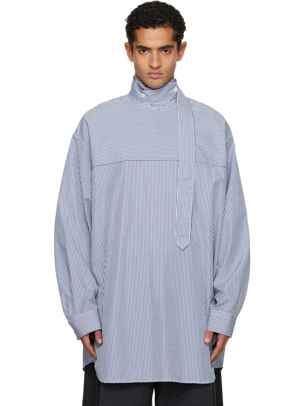Cotton poplin shirt. · Stripes throughout · Integrated wraparound tie with button fastening at stand collar · Shirttail hem · Dropped shoulders · Adjustable buttoned barrel cuffs · Button closure at back Supplier color: Navy 100% cotton. Made in Hungary 252358M192006