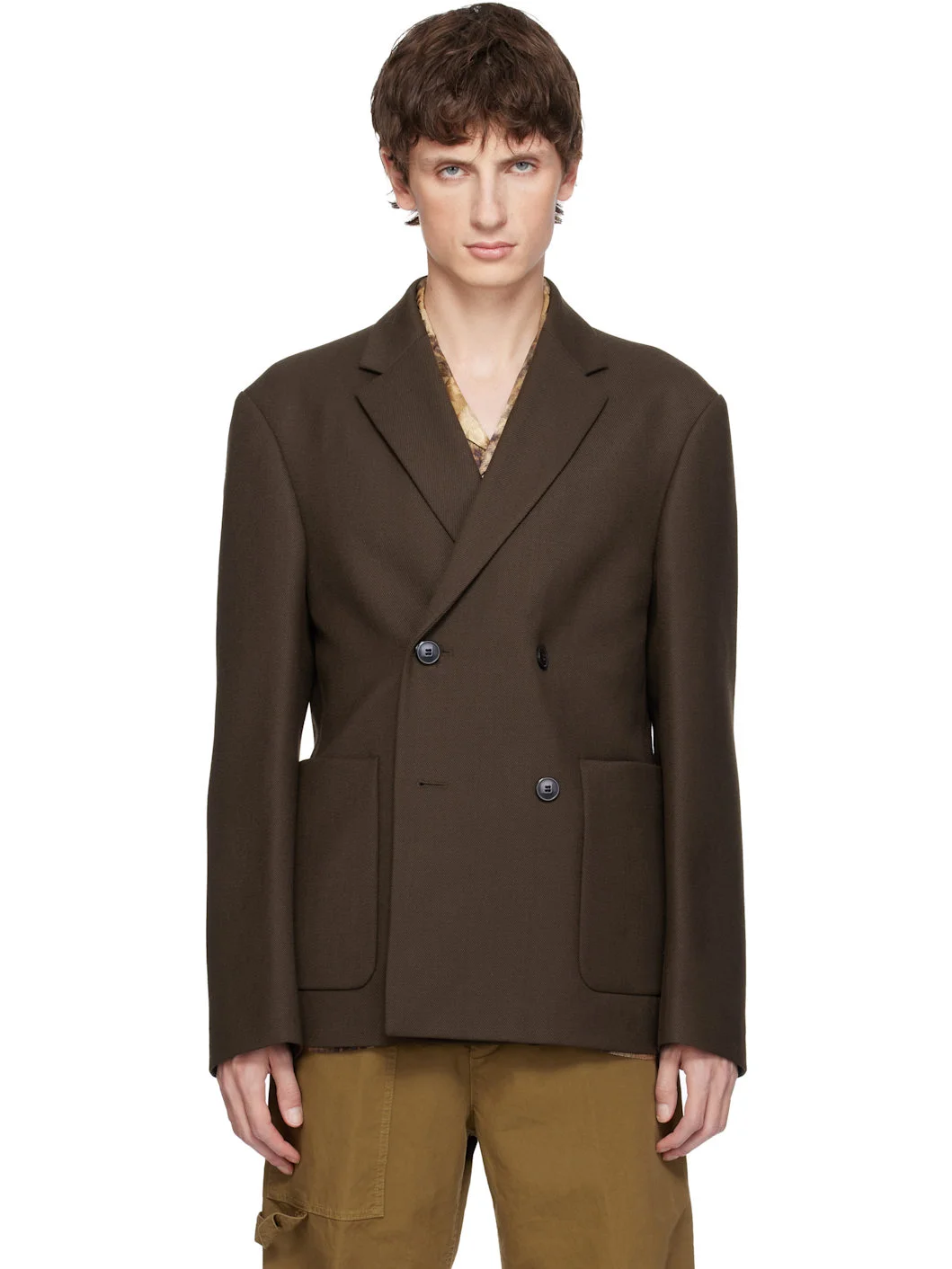 Boxy-fit wool twill blazer. · Notched lapel · Double-breasted button closure · Patch pockets at waist · Central vent at back hem · Welt pocket at interior · Partial satin lining Supplier color: Mud Body: 100% wool. Trim: 100% viscose. Made in Morocco 252358M195040