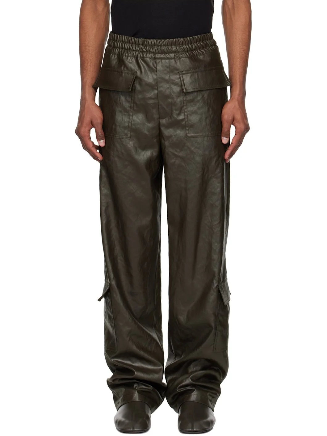Coated polyester crepe cargo pants. · Concealed drawstring at elasticized waistband · Five-pocket styling · Zip fly · Flap pocket at outseams · Darts at back waistband Supplier color: Khaki 100% polyester. Made in Romania 251358M188005