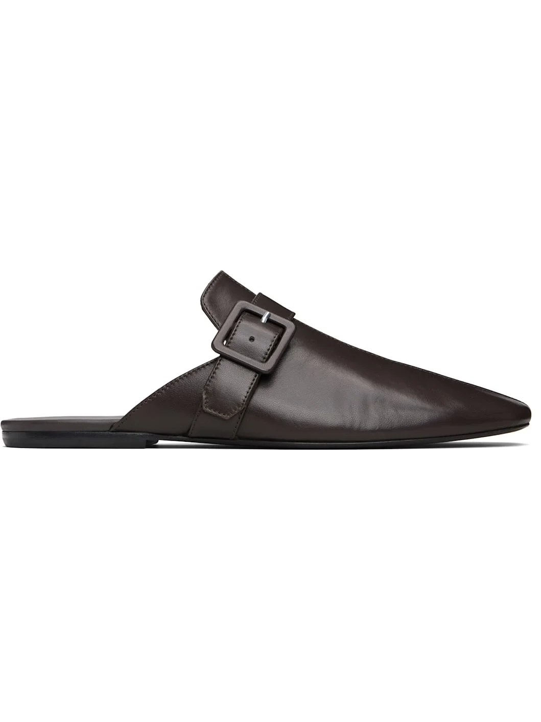 Buffed leather slip-on loafers. · Square toe · Pin-buckle strap at vamp · Leather sole with rubber injections Supplier color: Dark brown Upper: leather. Sole: leather, rubber. Made in Italy 252358M231016