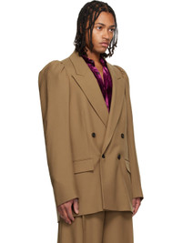 Wool twill blazer. · Peaked lapel · Double-breasted button closure · Flap pockets · Gathering at padded shoulders · Welt pockets at interior · Full cupro lining Supplier color: Tan Body: 100% wool. Lining: 100% cupro. Made in Morocco 252358M195006