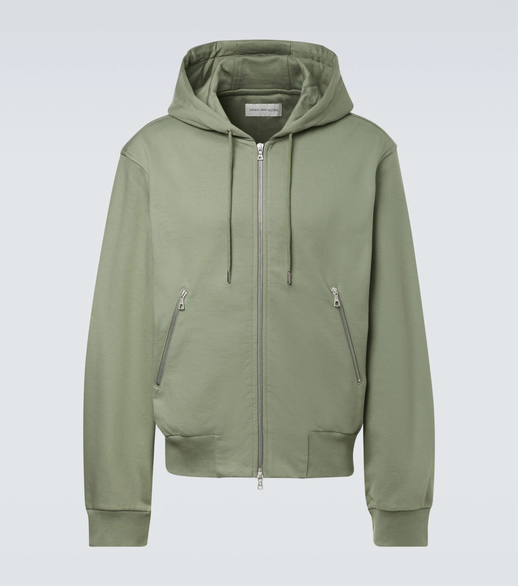 Juxtaposing a poetic sensibility with intelligent tailoring, Dries Van Noten creates styles that are always unique. Made purely from cotton, this hoodie has a two-way zip-up front, an adjustable hood, and ribbed-knit trims. Product Details - Material: 100% cotton - Care instructions: machine wash at 30 degrees - Made in Turkey - Color: green - Designer color name: Sage - Hardware color: silver - Closure: two-way zipped front - Drawstring hood - Pockets: zipped pockets - Cuff: ribbed - Hem: ribbed - Item number: P01135352 Size & Fit - True to size - Dropped shoulders - Designed for a loose fit - Elasticated hem - Slightly stretchy fabric - Falls below the hip - Height of model is 192cm-75.5" and wears a size L